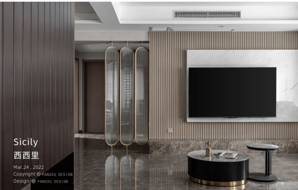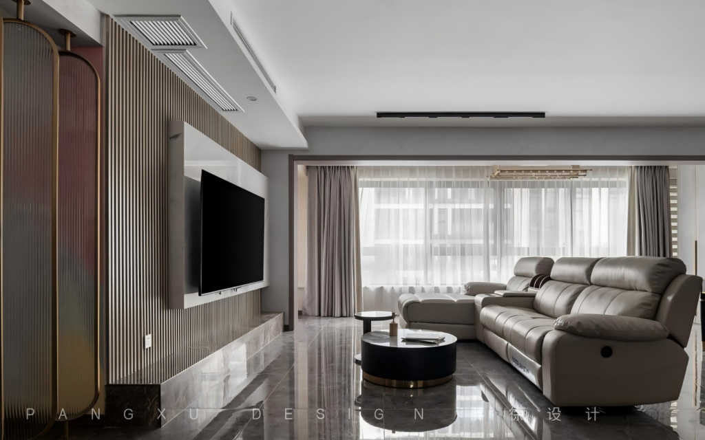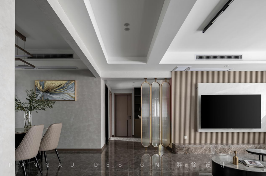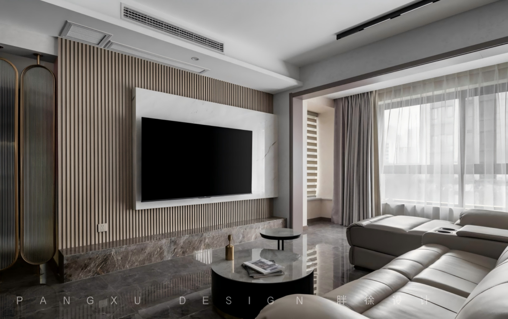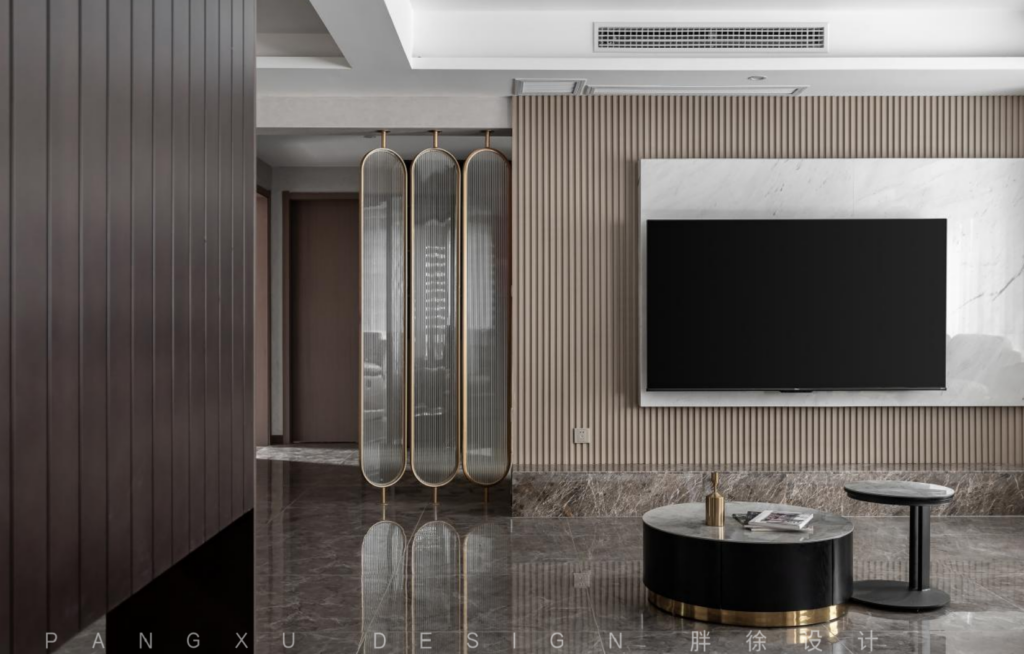 @胖徐设计工作室:大理石与格栅组合的电视背景墙,充满设计感的小心思,地台代替电视柜,不失整体性的石材铺设,浑然一体,内敛又不失格调。