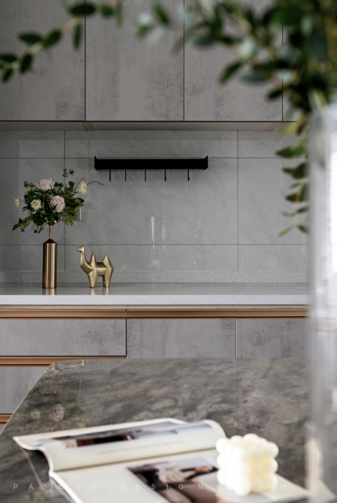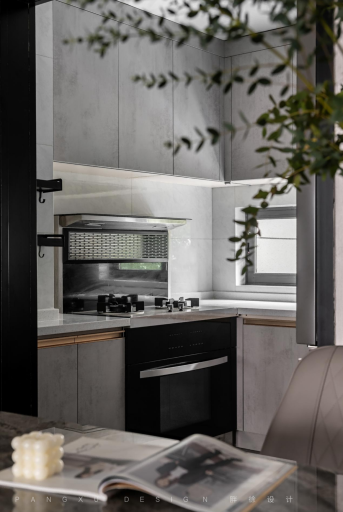 @胖徐设计工作室:开放式的厨房少不了集成灶的身影,简单的灰与白足够展现出生活的有条不紊。