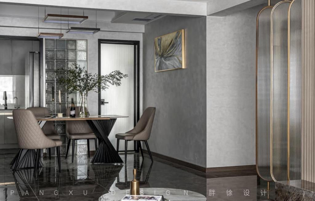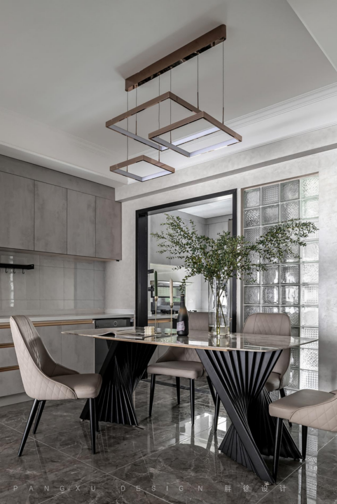 @胖徐设计工作室:通透的玻璃砖让光影产生朦胧的氛围感,与厨房同色系的边柜,餐厨整体更协调融合,将一部分厨房的功能移进餐厅,功能分区方便也更简洁大气。