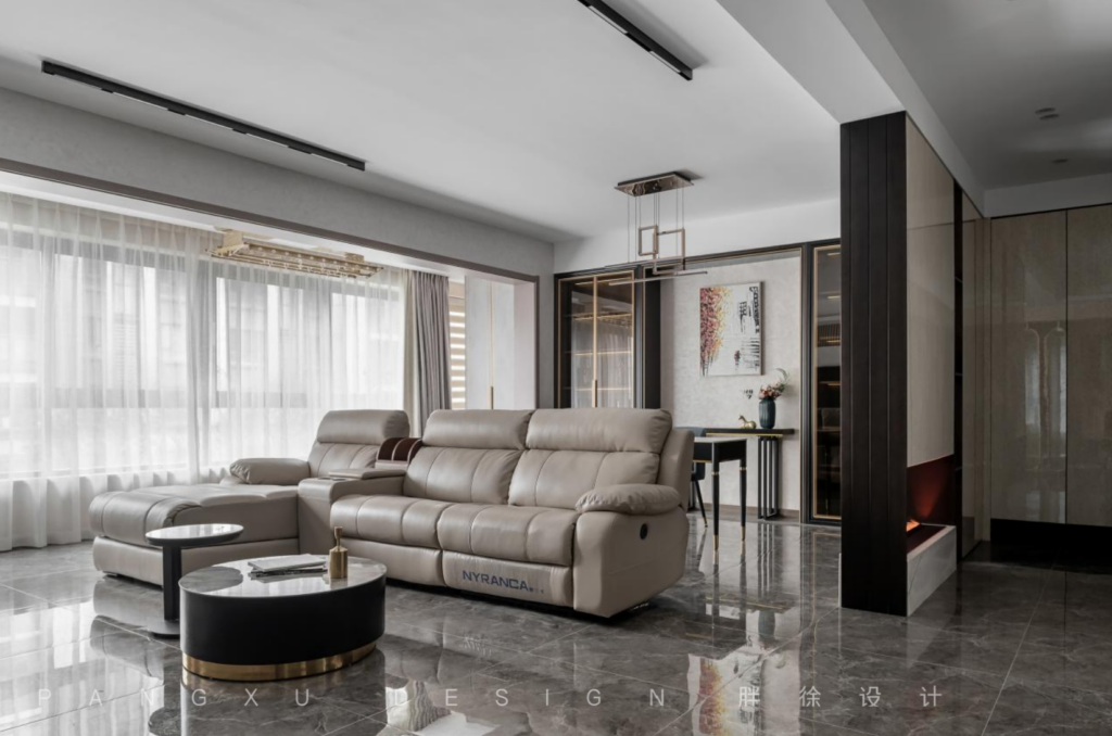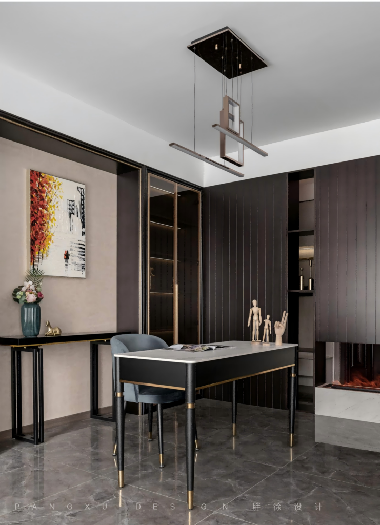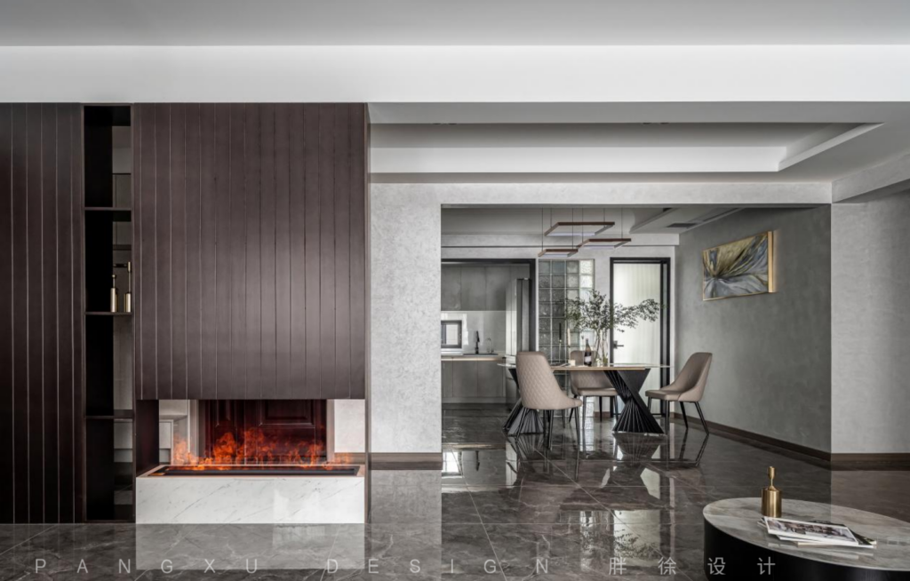 @胖徐设计工作室:壁炉消融了深灰地砖带来的冰冷感,分明的线条让整个客餐厅更干净利落,渐行渐显的玻璃屏风,分离出动静两区之间的界限,带来不一样的视觉体验。
