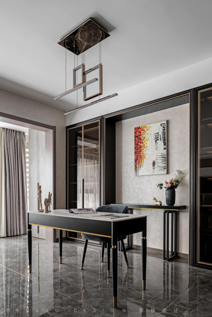 @胖徐设计工作室:开放式的书房不会过分沉闷,半透明的书柜,倒映出空间的几何转折,无拘无束的氛围,让整个书房更放松自在。