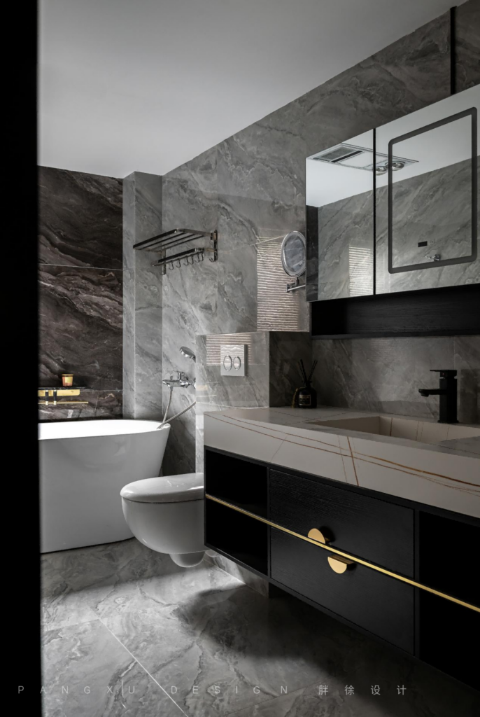 @胖徐设计工作室:主卫没有多余的色彩,大面积的灰色大理石铺就,纯白色的浴缸与壁挂式马桶的加入,让整个空间更流畅干净。