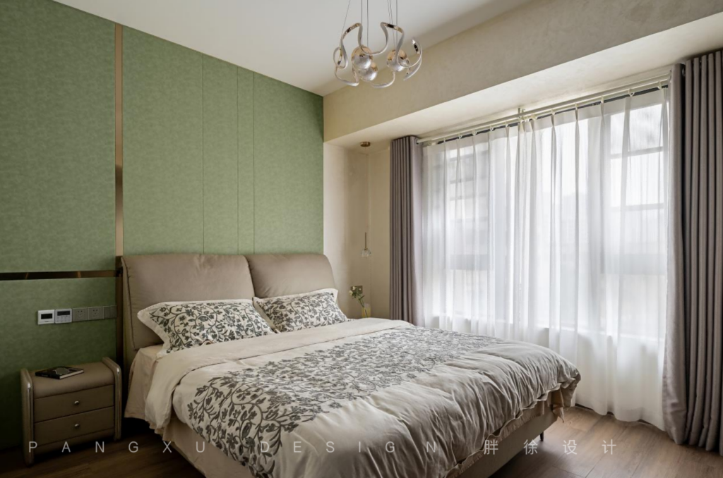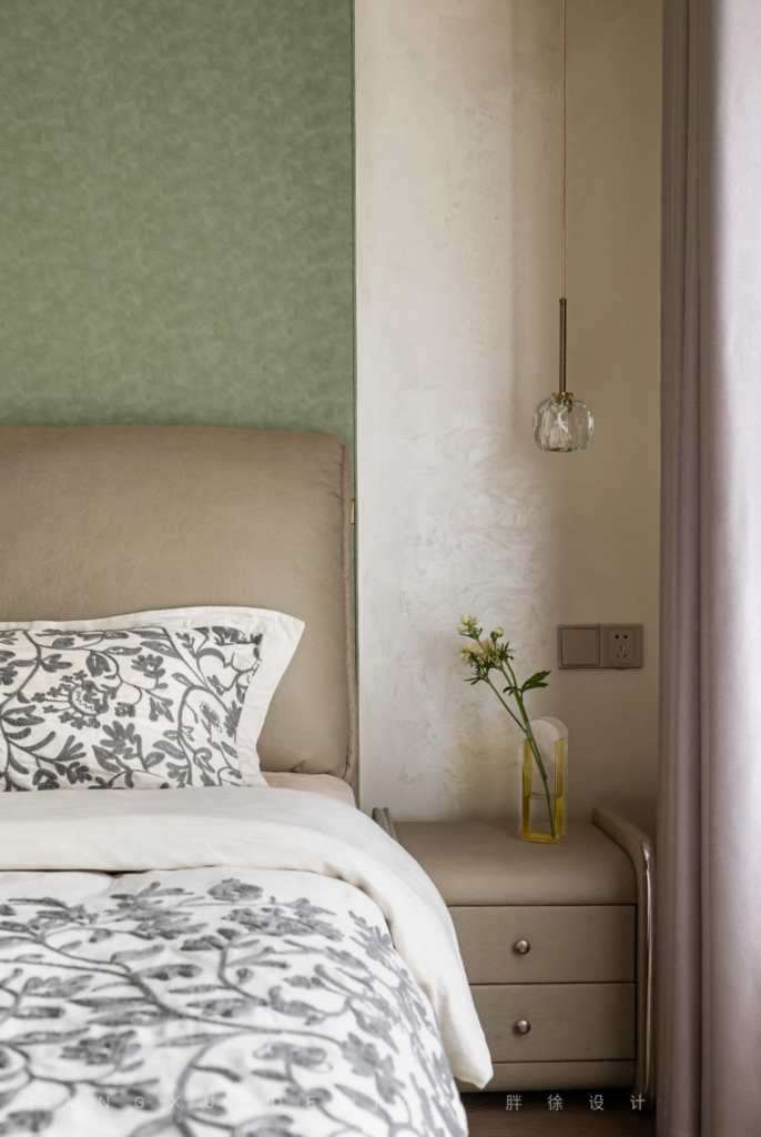 @胖徐设计工作室:将不一样的色彩融入主卧,墙面的纹理在光线下彰显出不一样的质感,没有艳丽的色彩,更易带来沉稳平和的睡眠体验感。