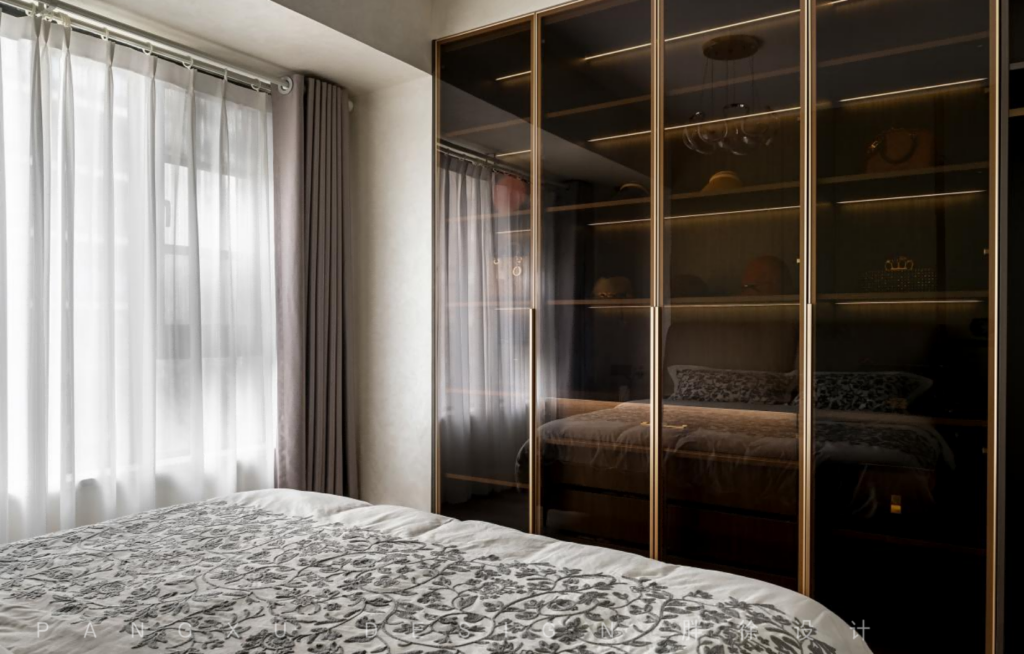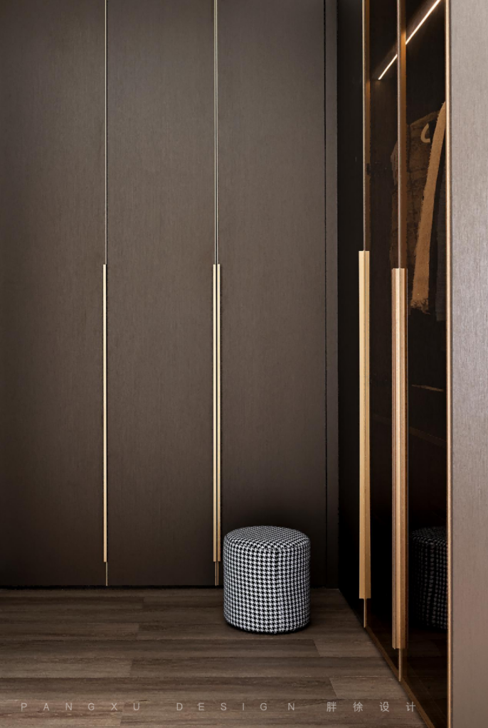 @胖徐设计工作室:茶色的透明玻璃门搭配感应灯条的衣帽间,充满年轻的时尚感。极简的金属质感把手,简单精致,呈现出恰到好处的轻奢气质。