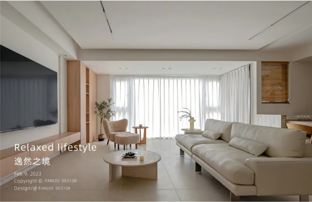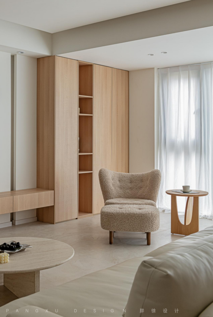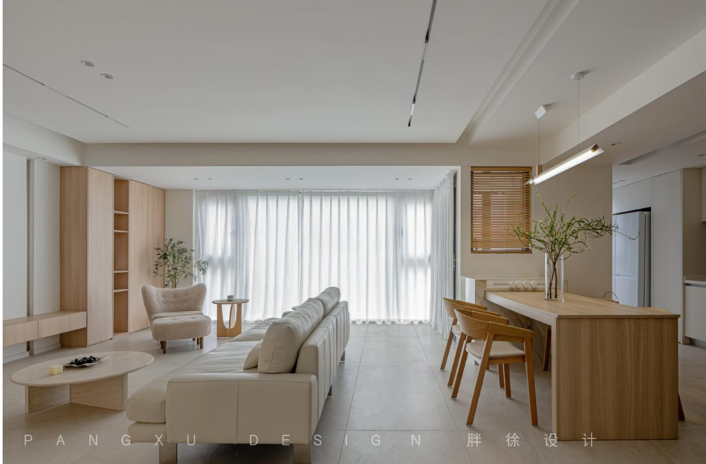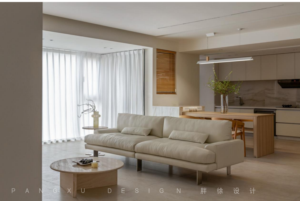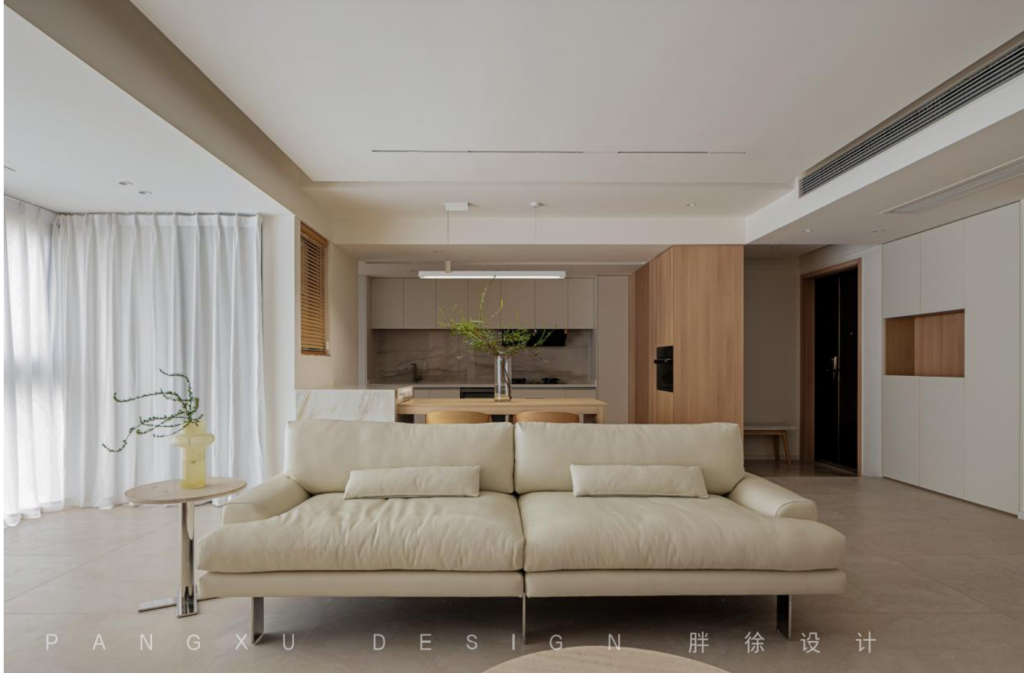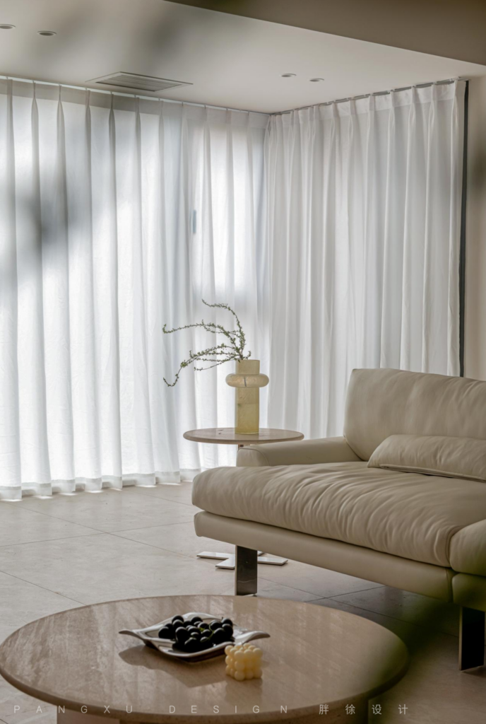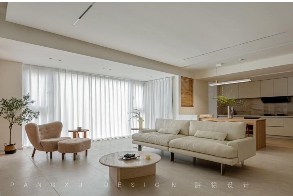 @胖徐设计工作室:透过窗帘柔化的光线,静谧怡然,客厅通铺暖调柔光砖,视觉上更显空间的温馨舒适,与客厅无主灯搭配,尽显满室温柔。