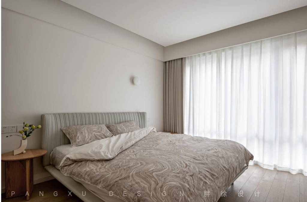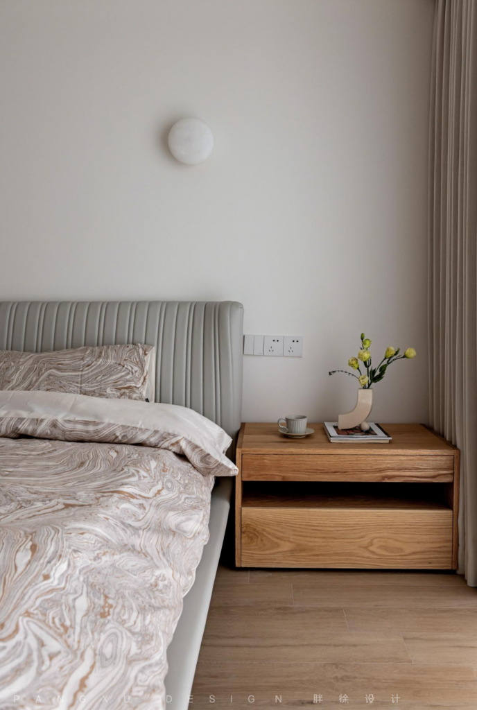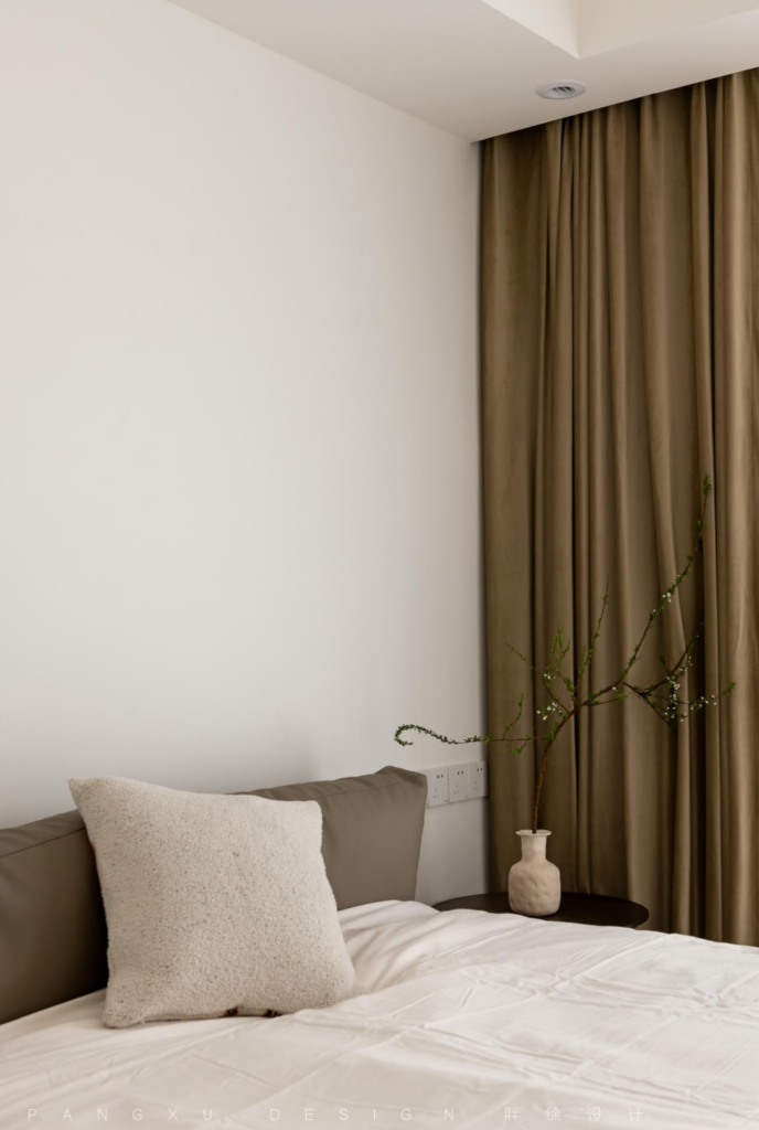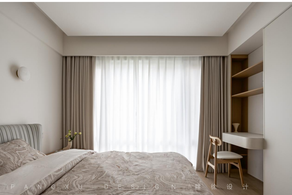 @胖徐设计工作室:主卧素雅,去繁从简,整体色调低调沉稳,用悬浮吊顶搭配灯带,氛围感十足。