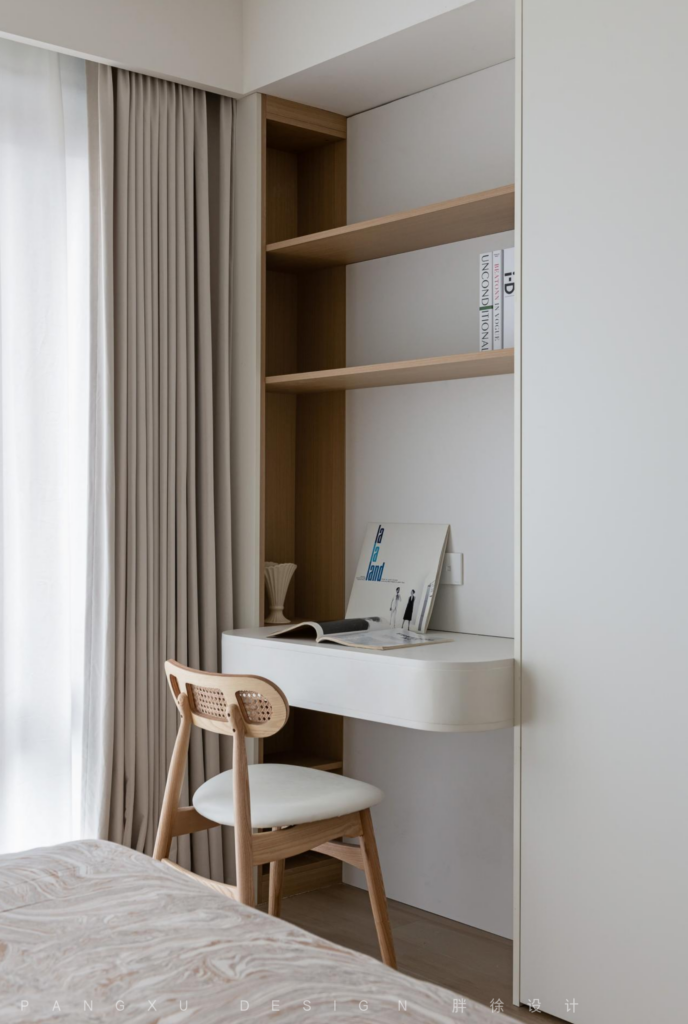 The customized desk and bookshelf were more integrated, and the color was harmonious and unified. The design of the hanging space was simple and light, without a clean corner, and it was convenient to clean.