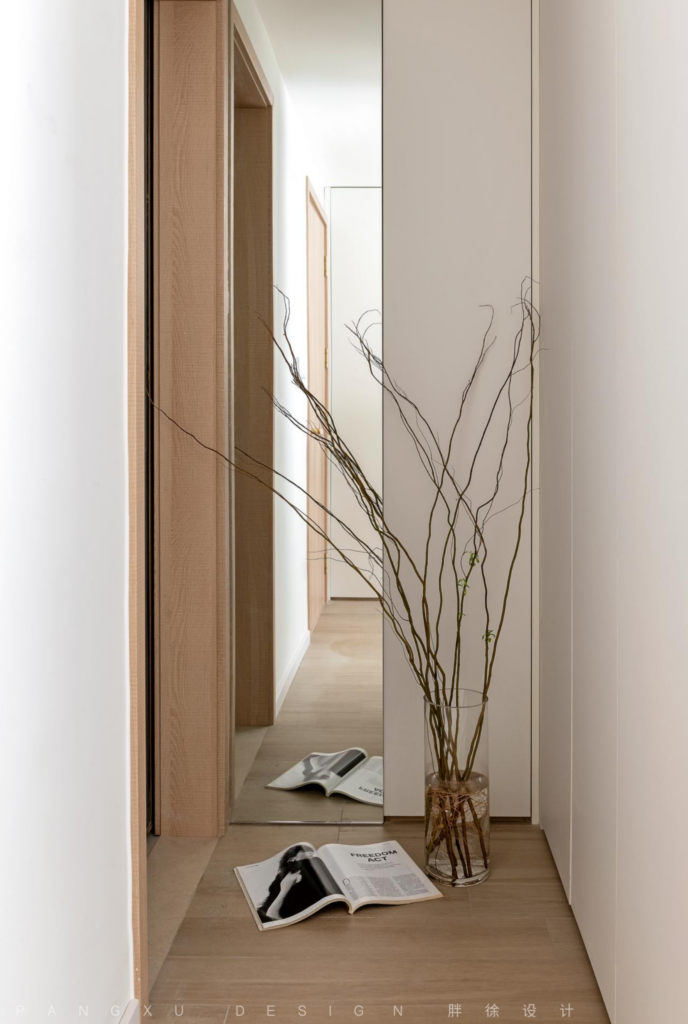 @胖徐设计工作室:衣帽间延续整屋的温柔配色,原木加白色,整洁有序。