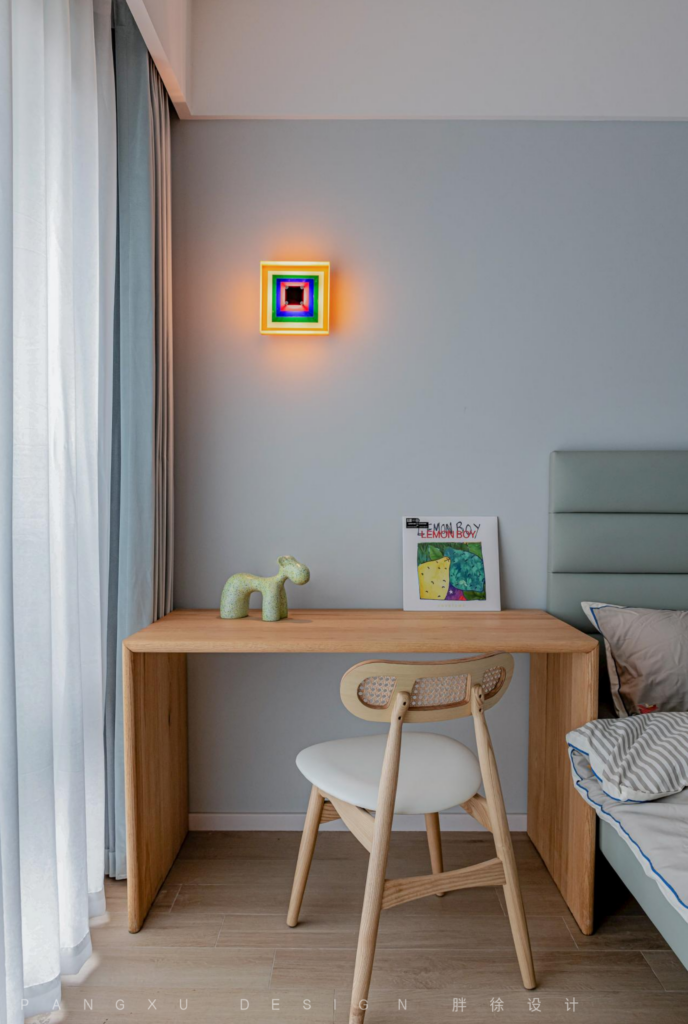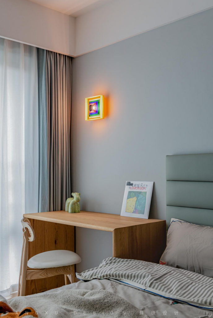 @胖徐设计工作室:简约的原木桌椅增加了儿童房的温柔感,靠窗设计,采光更好,也增添了儿童房的功能性。