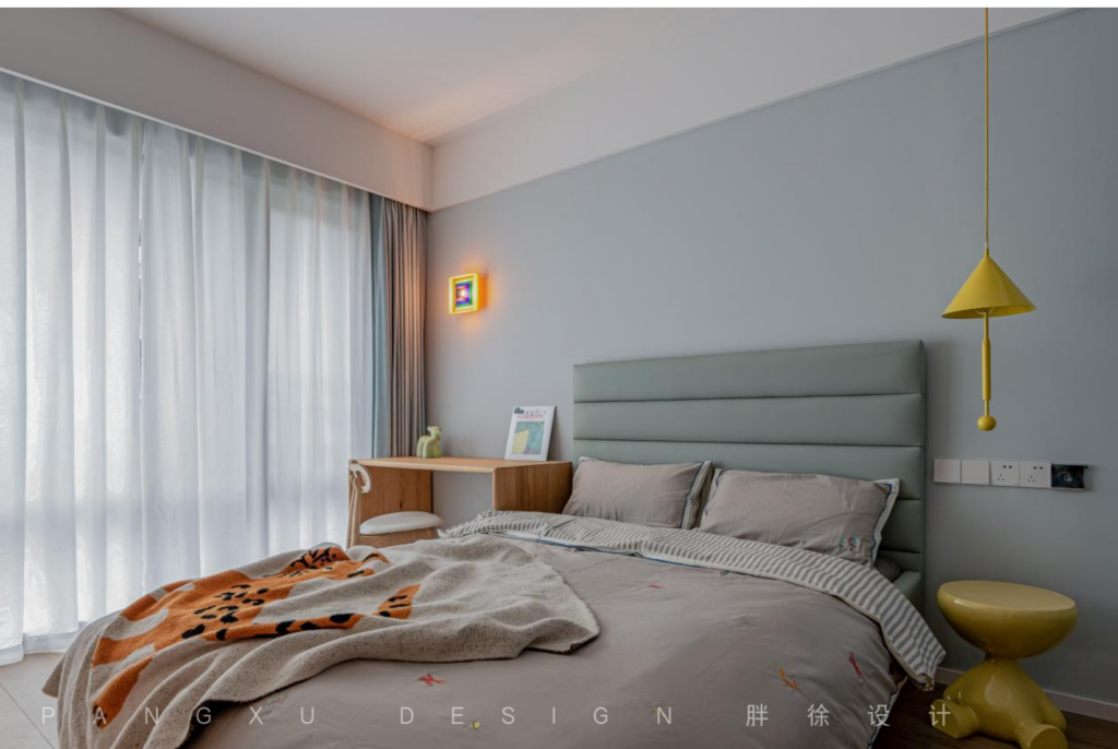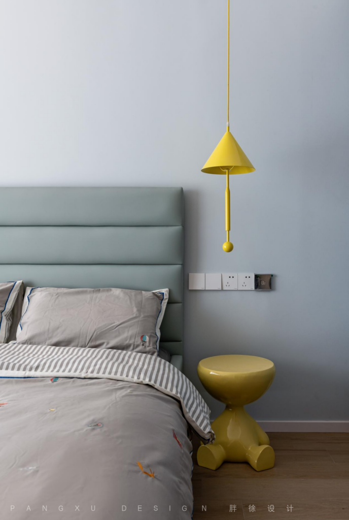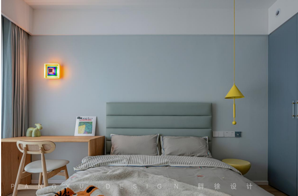 @胖徐设计工作室:儿童房的色彩相对其它空间更加丰富,背景墙的浅蓝色与衣柜的深蓝相互呼应,又层次分明,再用少量的亮黄色碰撞出生动的色彩变化。