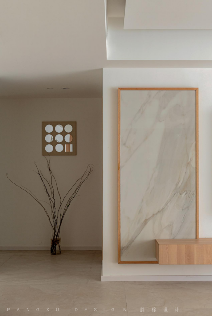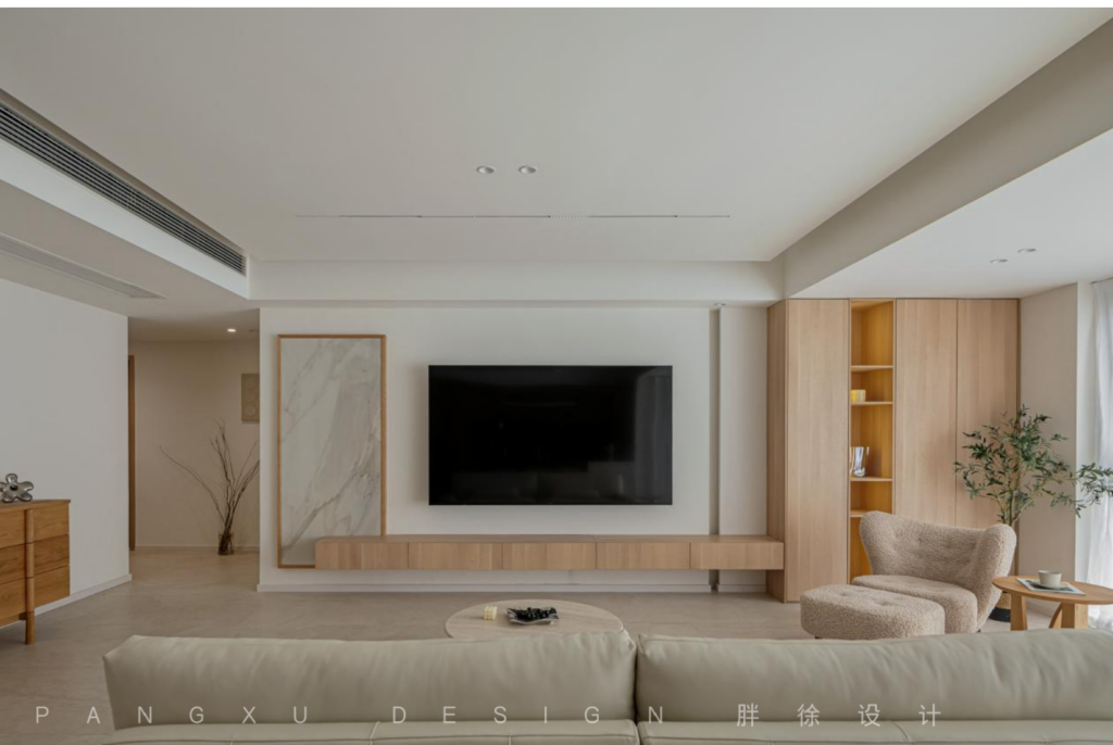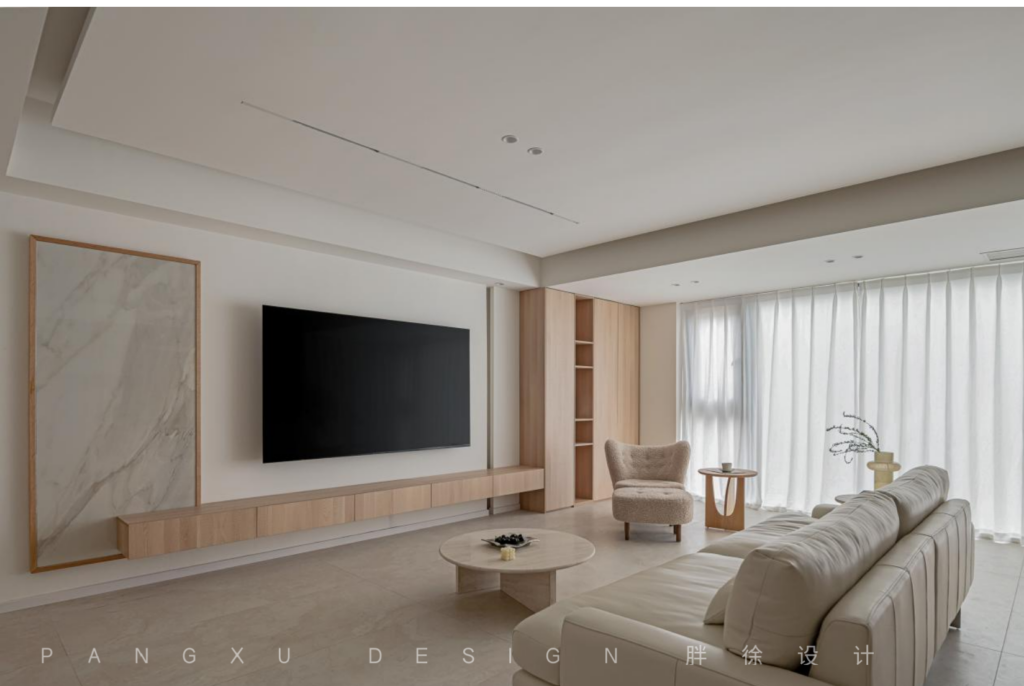 @胖徐设计工作室:纯白的电视背景墙,用纹理自然流畅的大块瓷砖装饰,让原本素净的背景墙更生动优雅,与原木悬空设计的电视柜搭配,更显整体空间的简约轻盈。