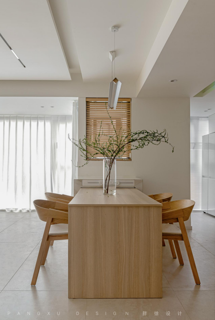 @胖徐设计工作室:餐厅餐桌岛台一体的设计,功能性更强,可伸缩设计的餐桌,更方便家庭聚会与亲子互动,白色岛台加原木桌椅,温柔和谐,一侧的纯白色橱柜,与整个客餐厅色调统一,更显开放式厨房的干净透亮。