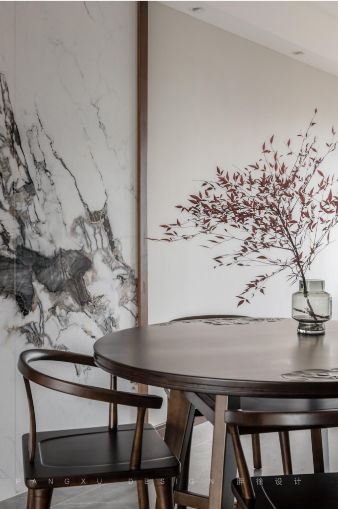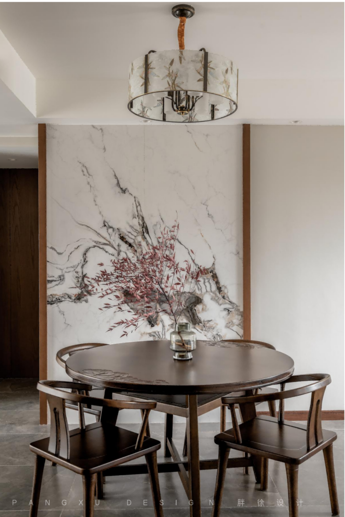 @胖徐设计工作室中式讲究天圆地方的规整,圆桌寓意着团团圆圆,在写意的水墨背景下,更显中式的深邃内敛与雅致。