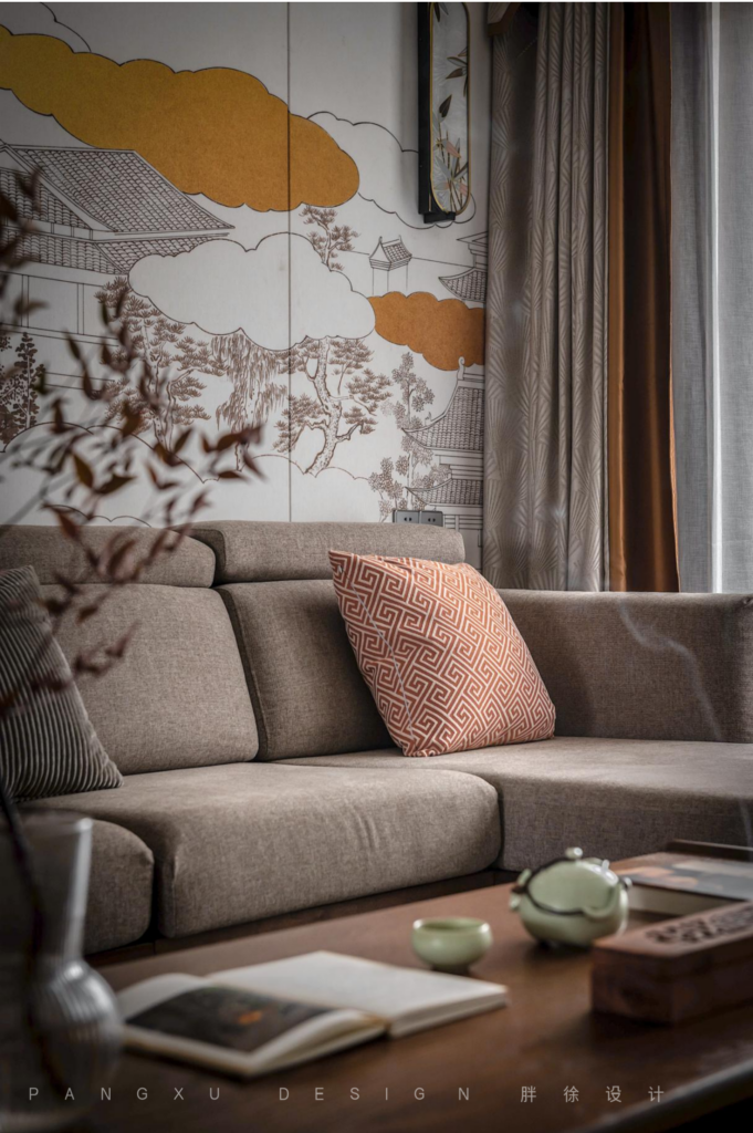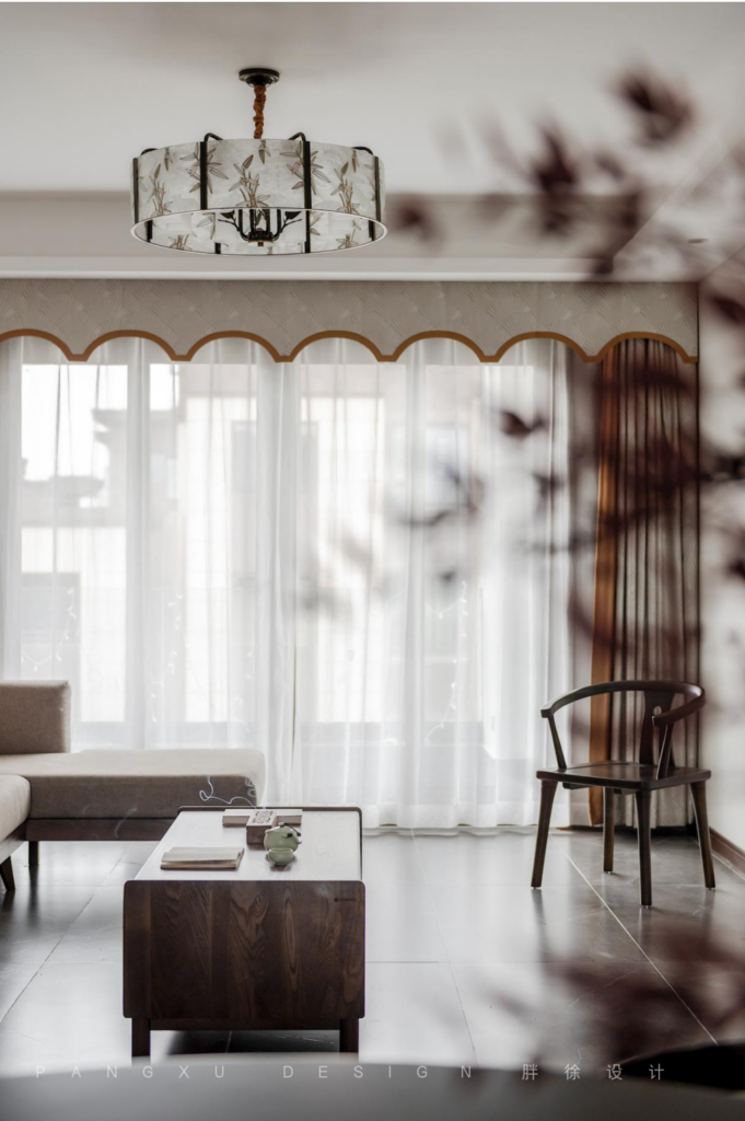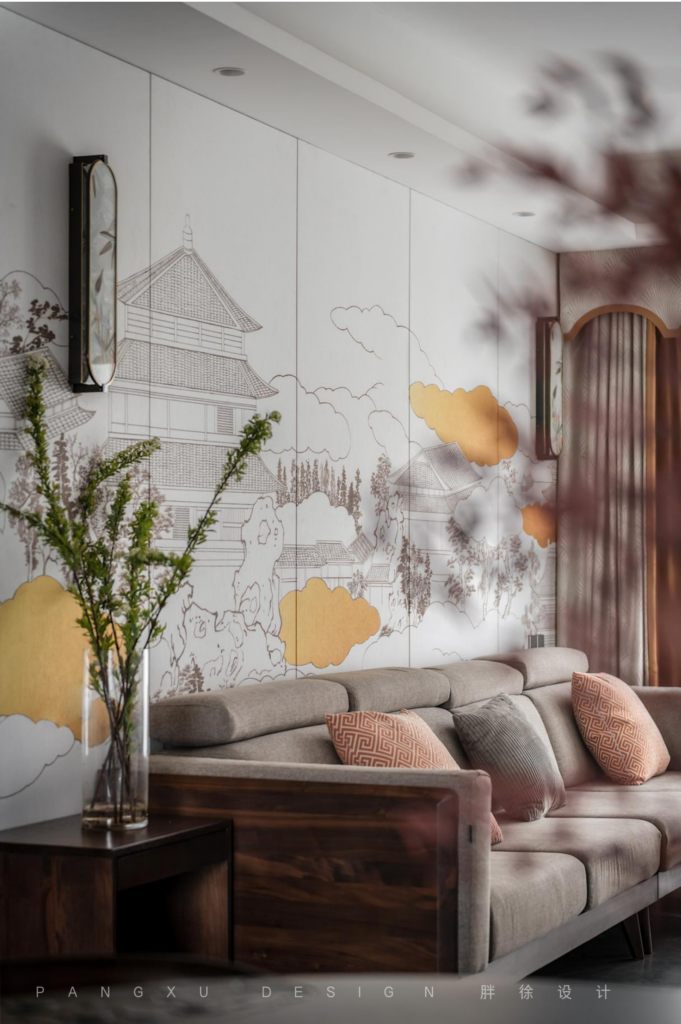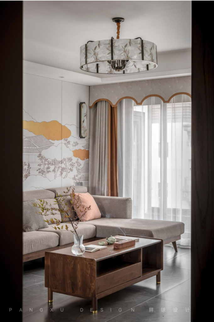 @胖徐设计工作室:木质稳重与温润的韵味渗透于此,暖色调带来柔和的氛围感给予归家人放松而平静的抚慰,似屏风设计的沙发背景墙,铺就古典的绘画,又增添了中式的精致素雅。