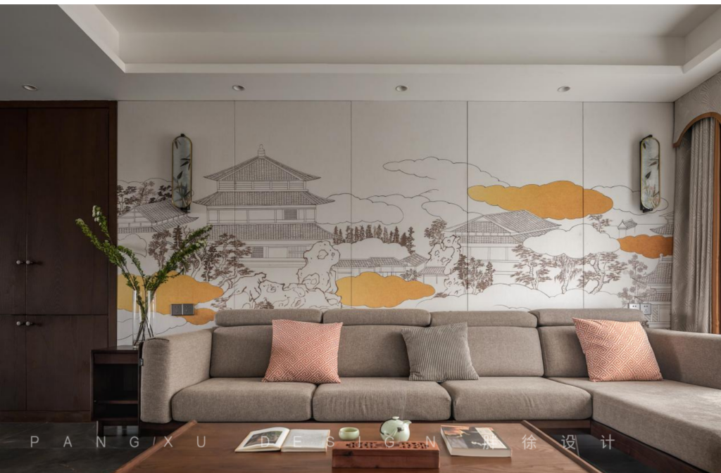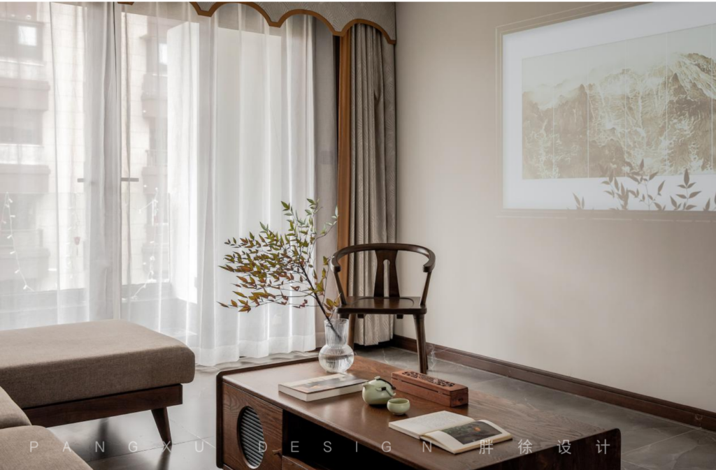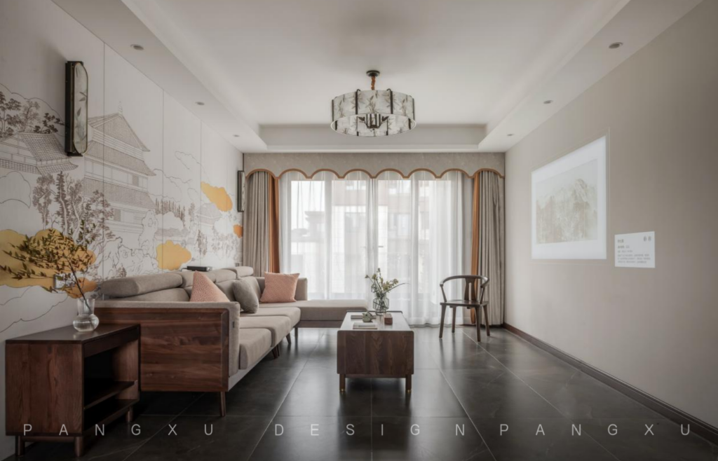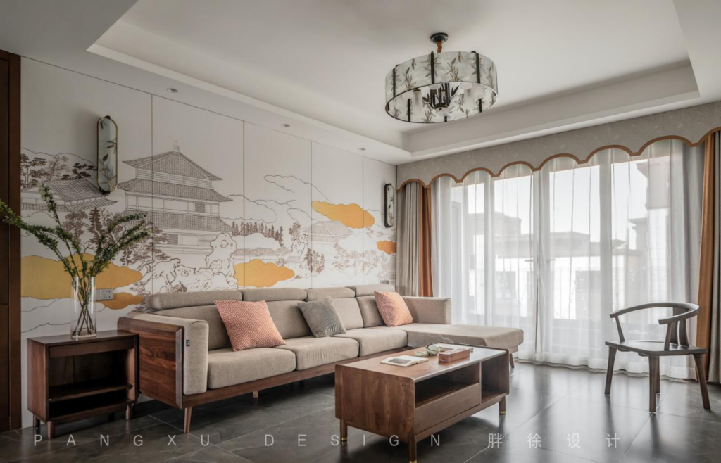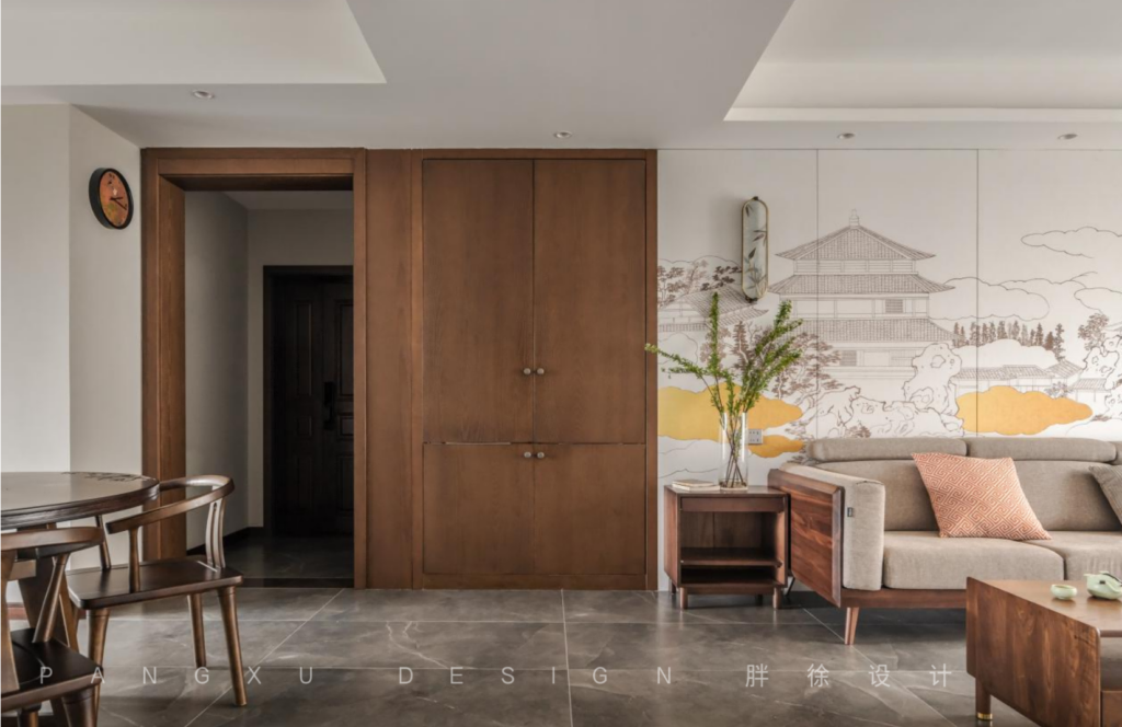 @胖徐设计工作室:木质稳重与温润的韵味渗透于此,暖色调带来柔和的氛围感给予归家人放松而平静的抚慰,似屏风设计的沙发背景墙,铺就古典的绘画,又增添了中式的精致素雅。