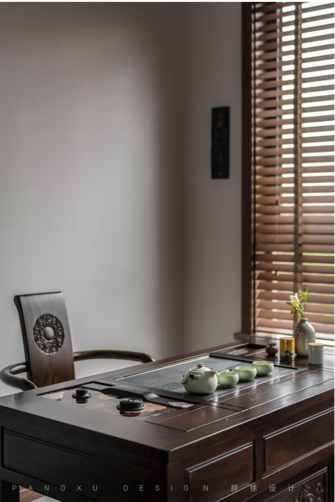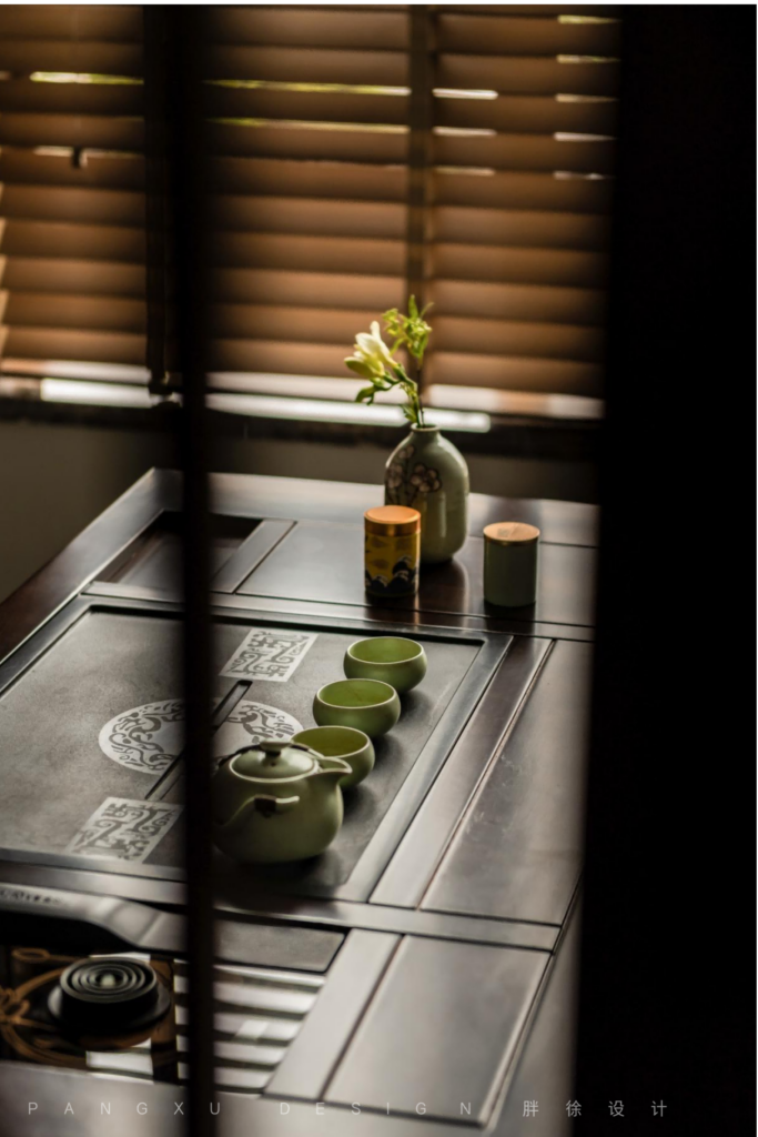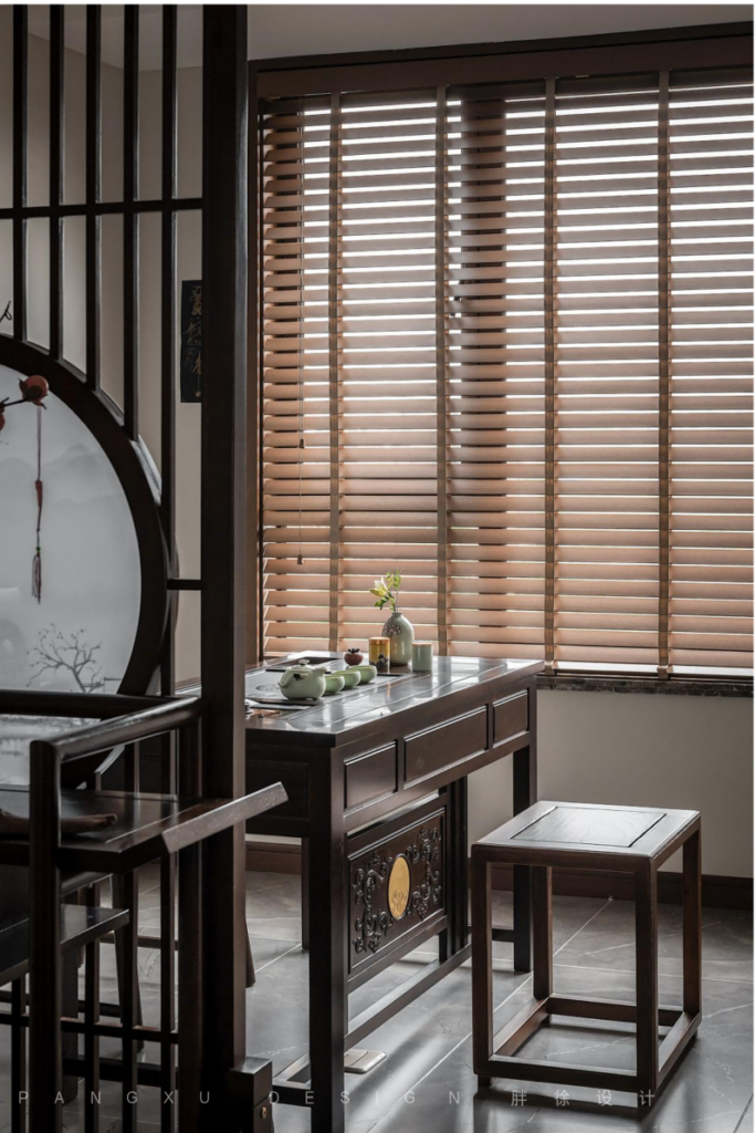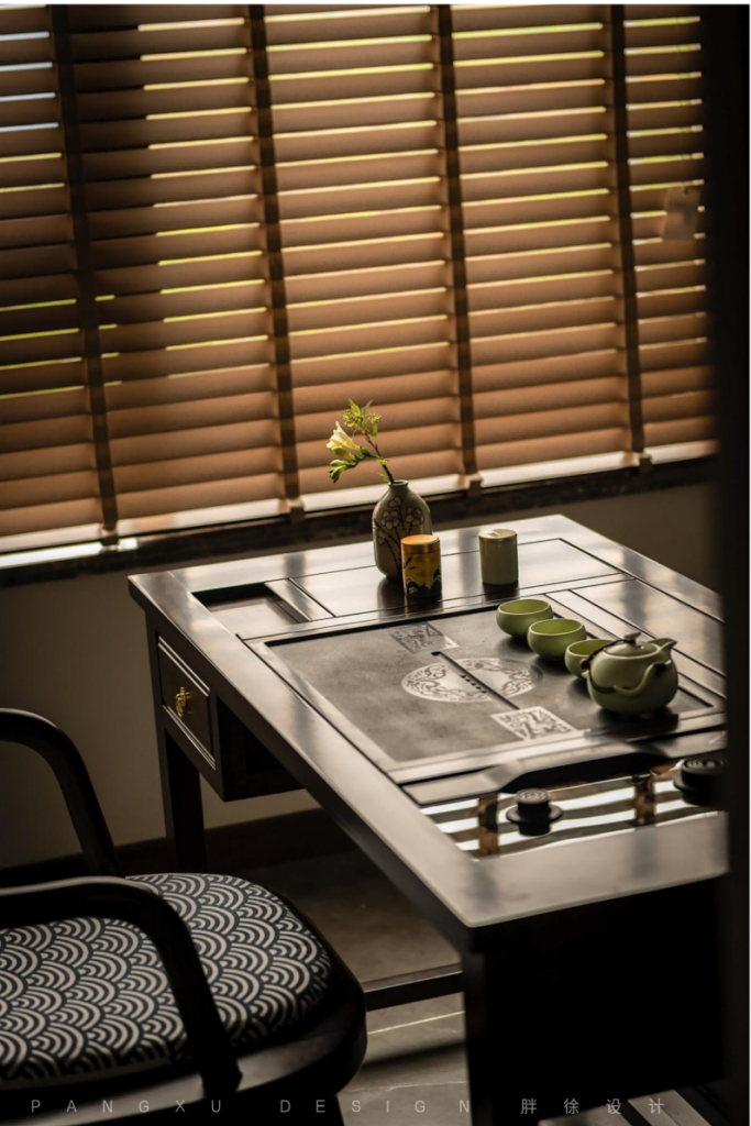 @胖徐设计工作室:木百叶裁剪的光影,氤氲温柔,点一盏香,品一壶茶,此时此刻也能感受古人“闲看庭前花开花落,漫随天外云卷云舒”的闲趣。