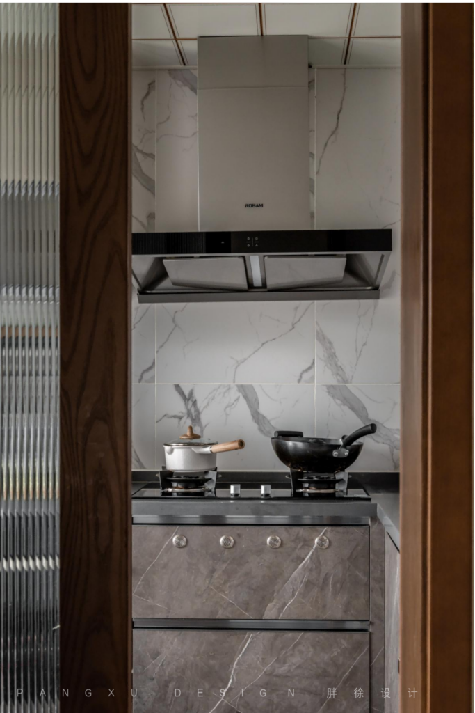 @胖徐设计工作室:一门之隔,厨房的内与外,是两种不同的景致,现代与中式的碰撞于此展现,却又契合于此的宁静深邃。