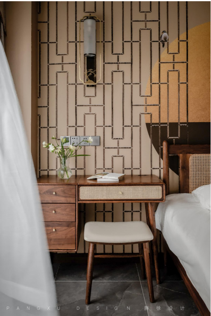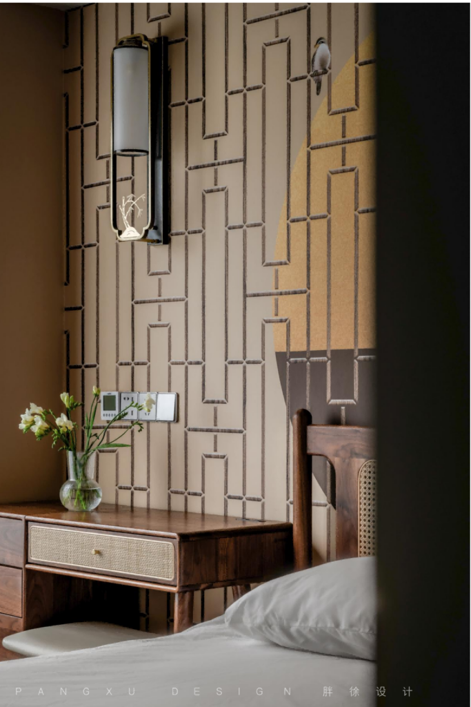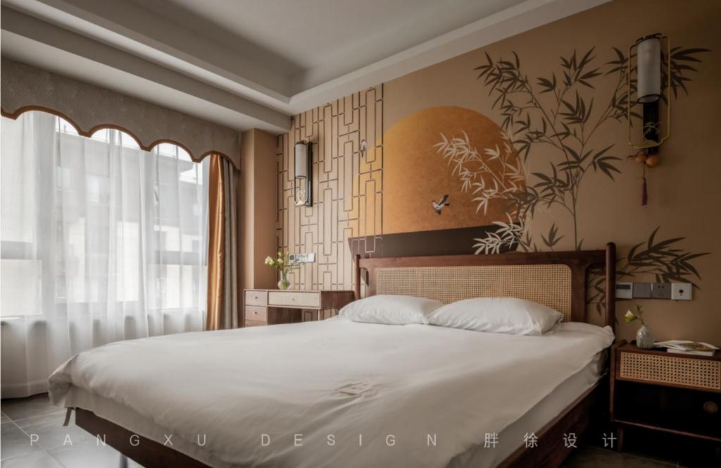 @胖徐设计工作室:主卧增添了不少的藤编元素,自然朴素,古色古香的背景墙,用竹之清雅铺就宁静舒适的休憩气息。轻纱拂起,就让温柔的微风扫去一天的疲惫。
