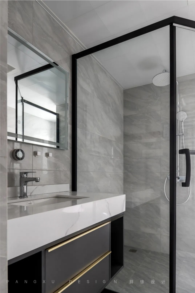 @胖徐设计工作室:主卫没有多余的装饰,简单得刚好,加一点金属装点,有着不失细节的精致。