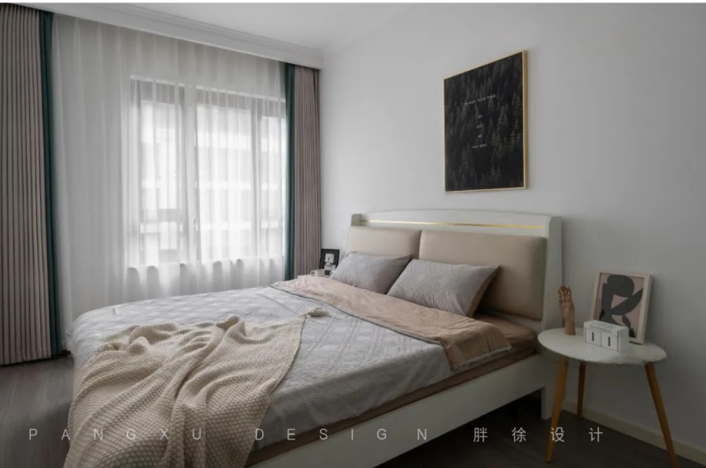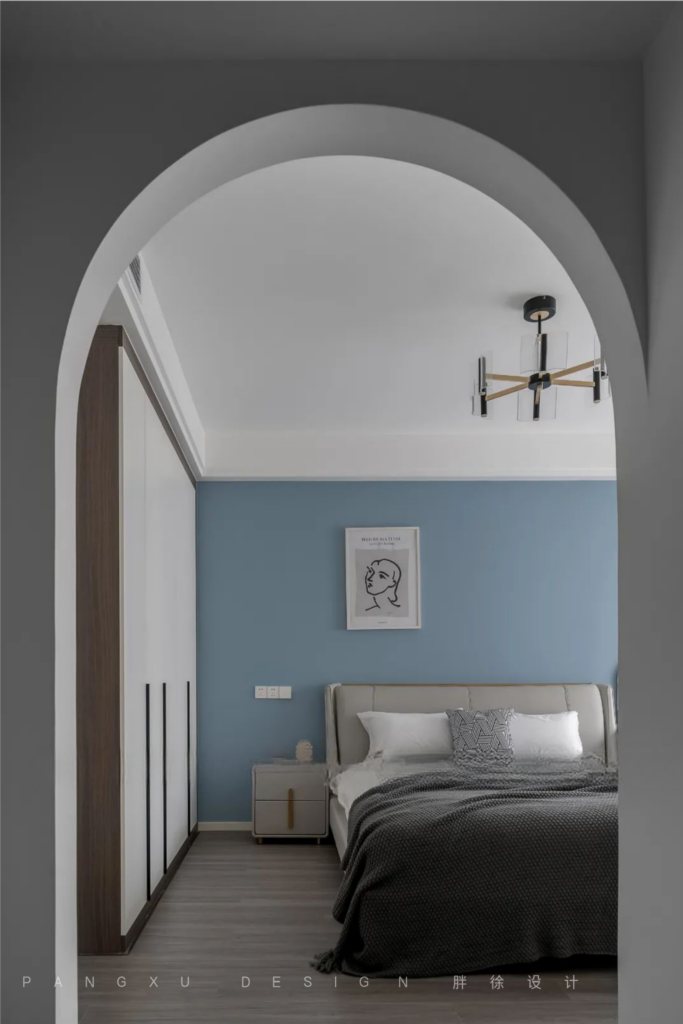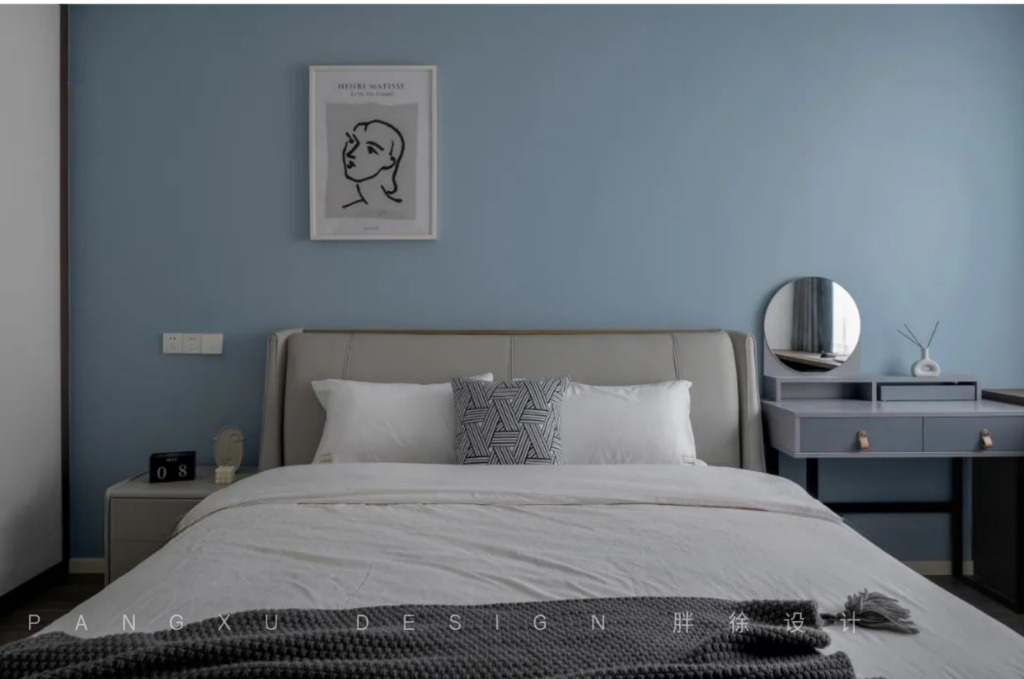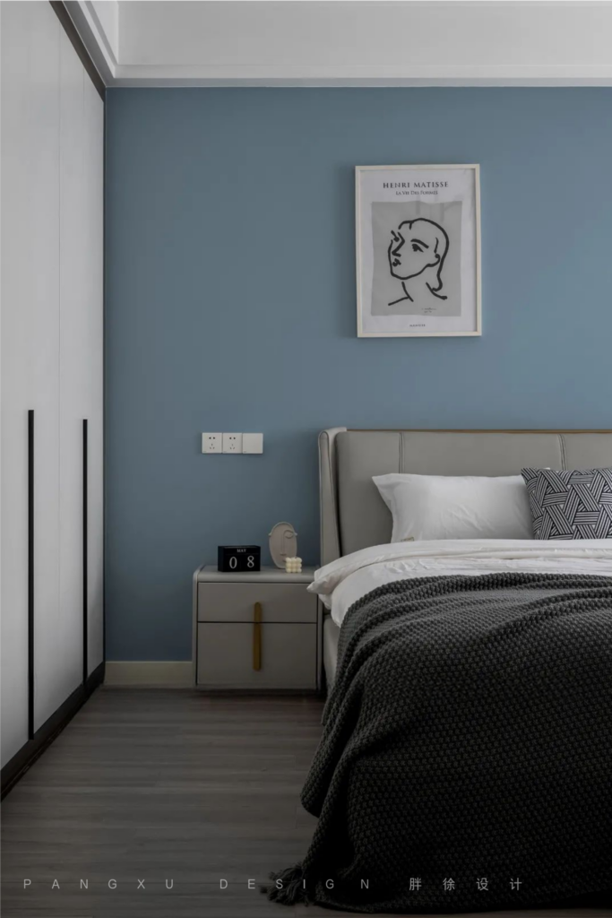 @胖徐设计工作室:不同于客餐厅的黑与白,主卧大面积静谧的蓝,犹如平静的海,被空间包裹的色彩在此相互融合呼应,释放着它们独有的氛围感,随性柔和。