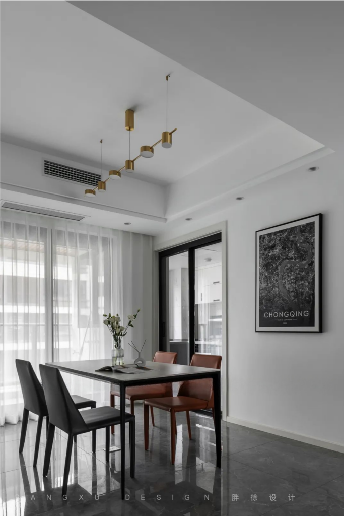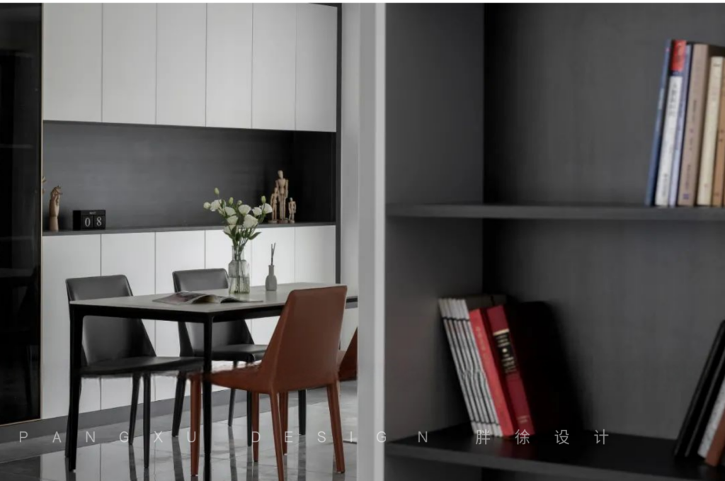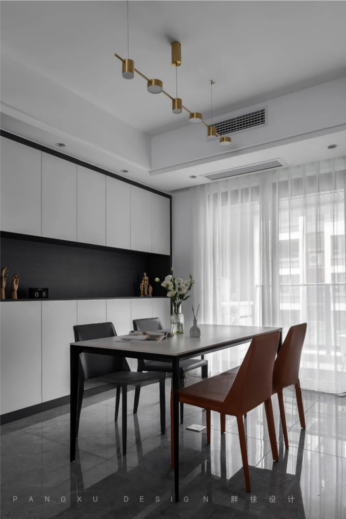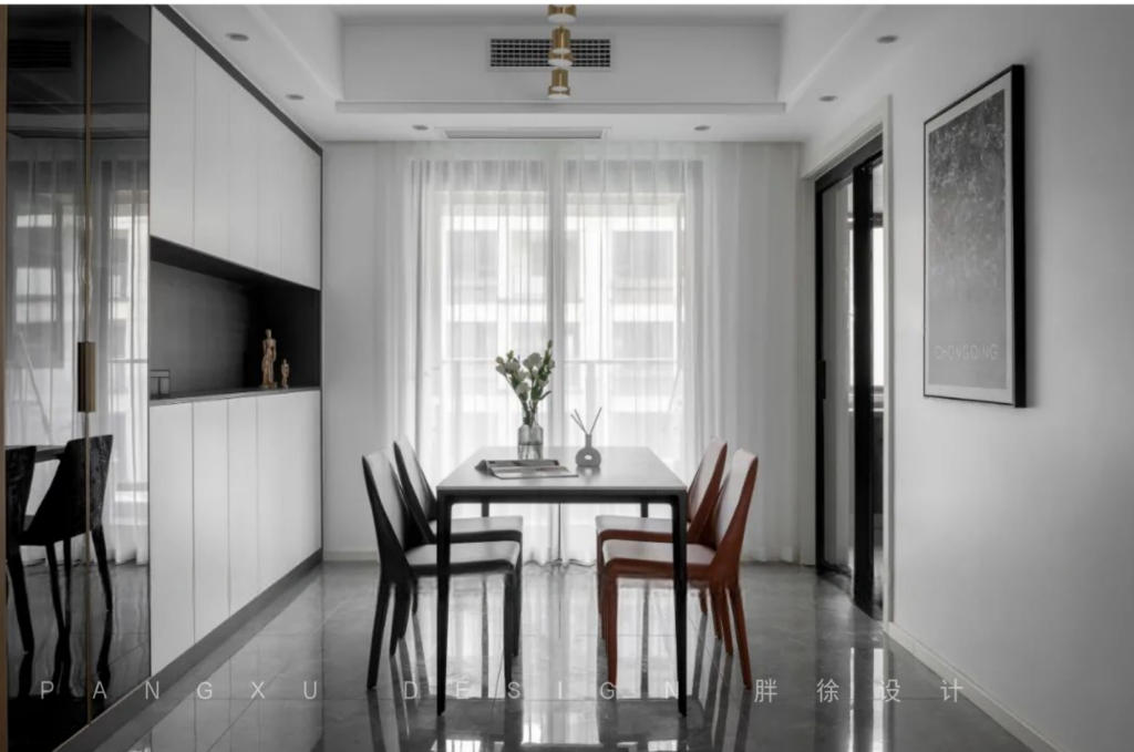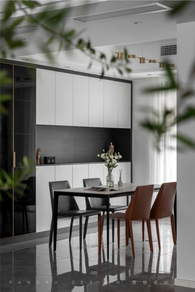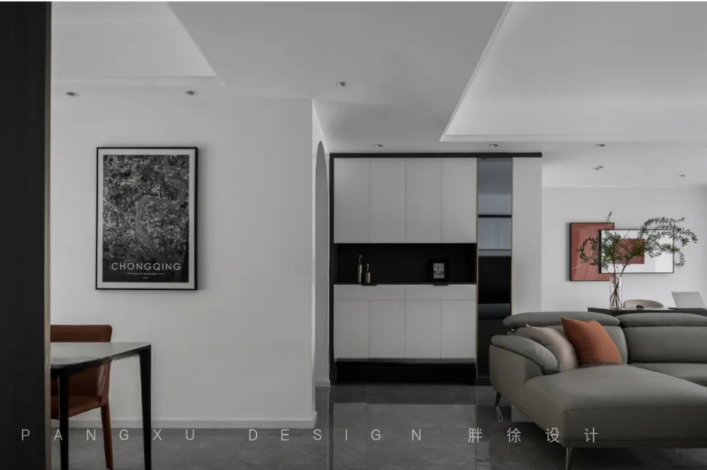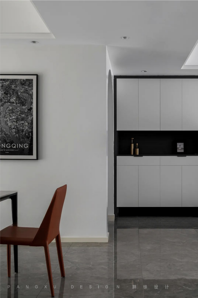 @胖徐设计工作室:简约的白色边柜带来的魅力在这恰到好处的展现,半透明的玻璃柜,诠释朦胧的高级质感,明亮与暗黑的交织,赋予空间变化的格调。