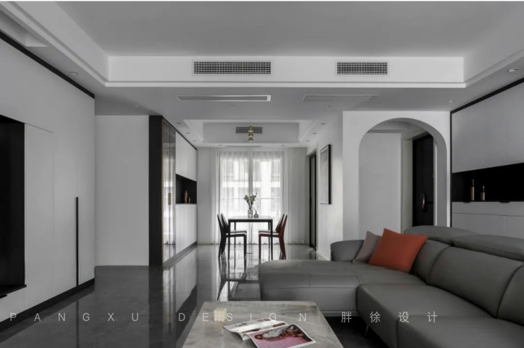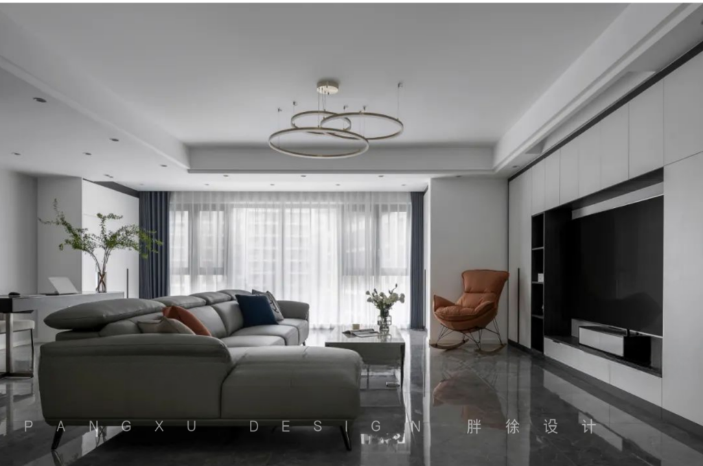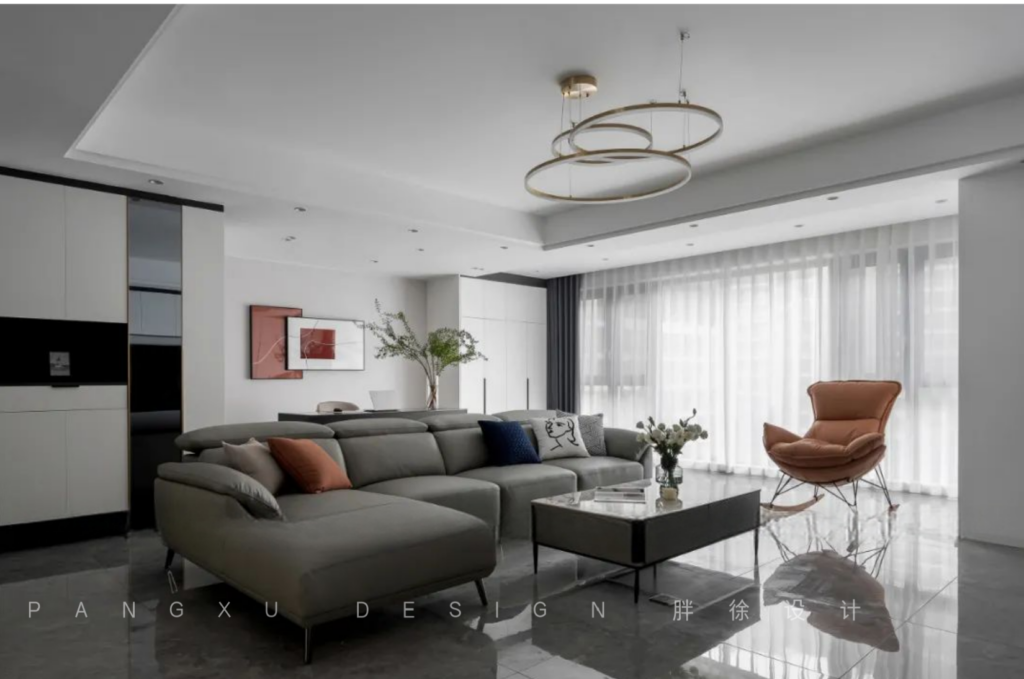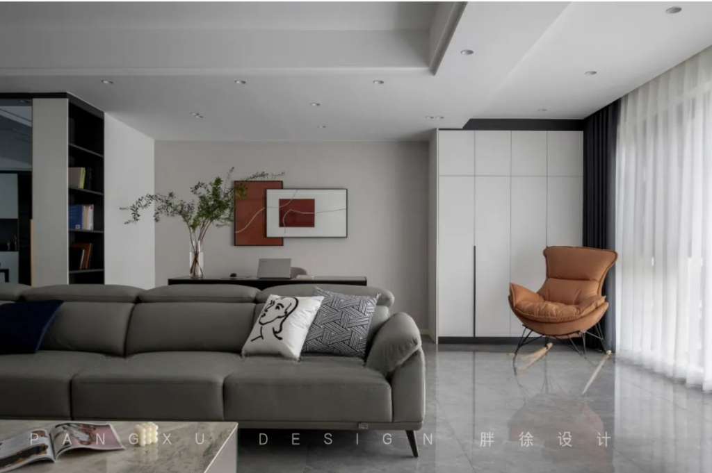 @胖徐设计工作室:黑白灰是客厅的主题色,一整面的落地窗带来更为通透大气的空间感,加一点橘色增添色彩氛围的活力,明与暗,交织与呼应,沉浸于光影带来的变幻。