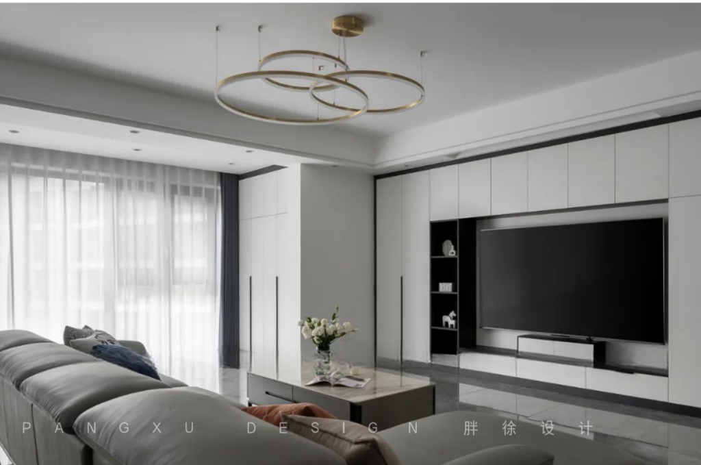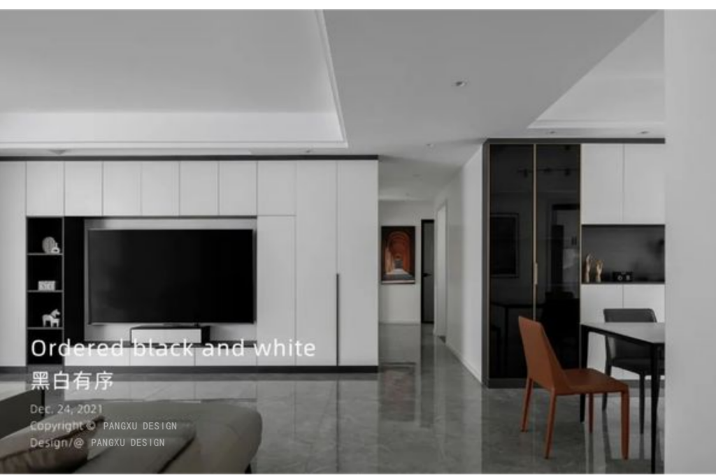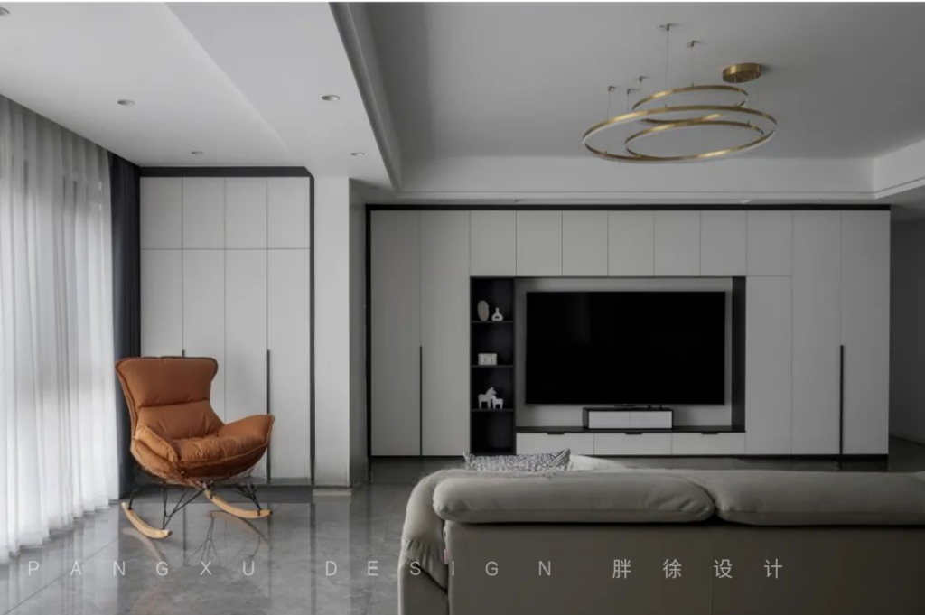 @胖徐设计工作室:储藏式的电视背景墙,白与黑的极致处理,简洁明了,留下足够的储物空间,消除堆放的无序。