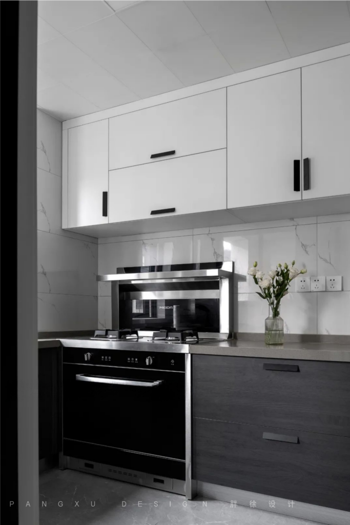 @胖徐设计工作室:经典的黑白配百看不厌,灰色填补剩余的空白,U形的操作台面足够两人一起完成烹饪的治愈。