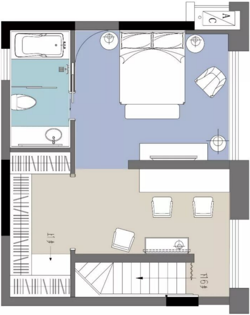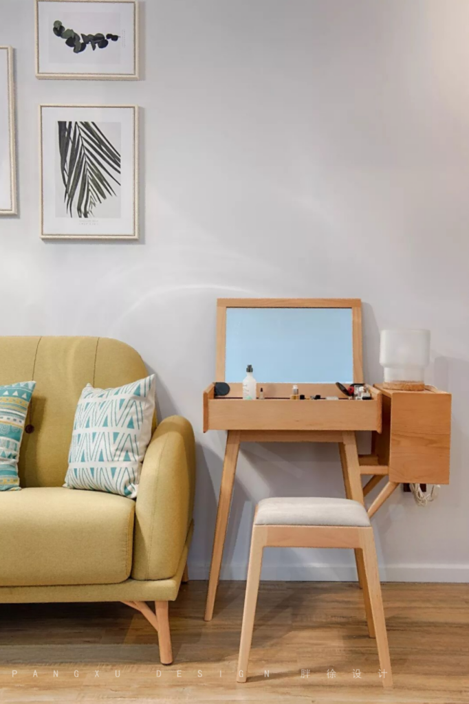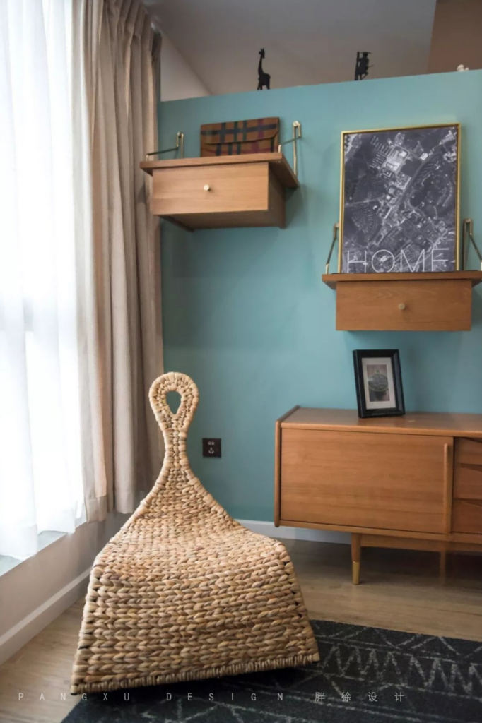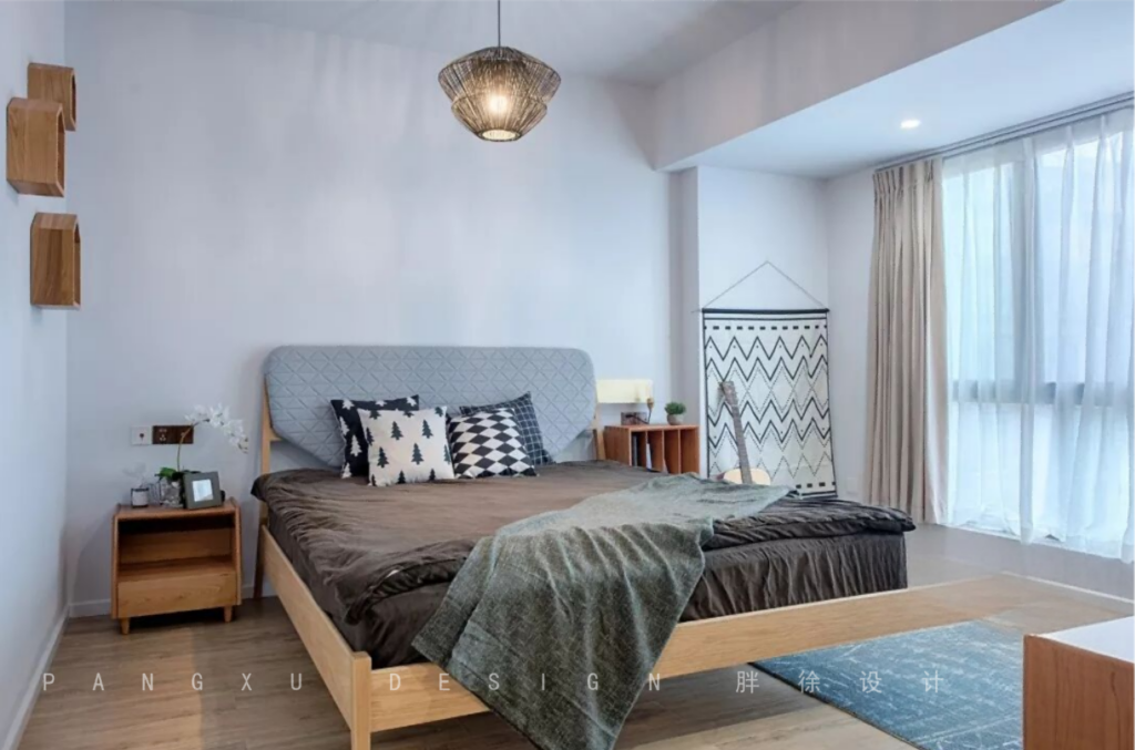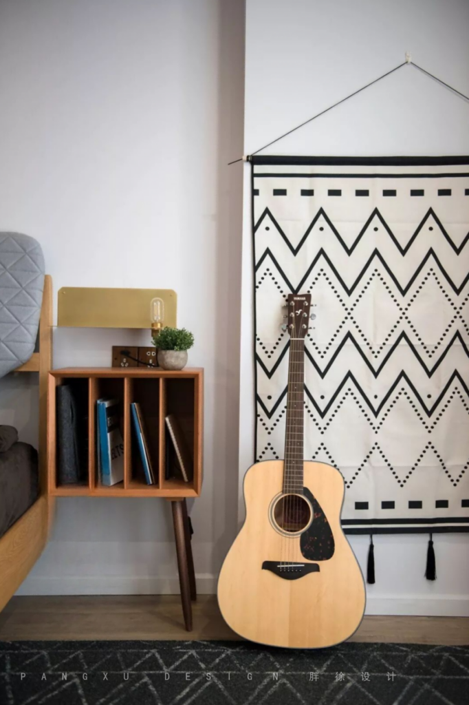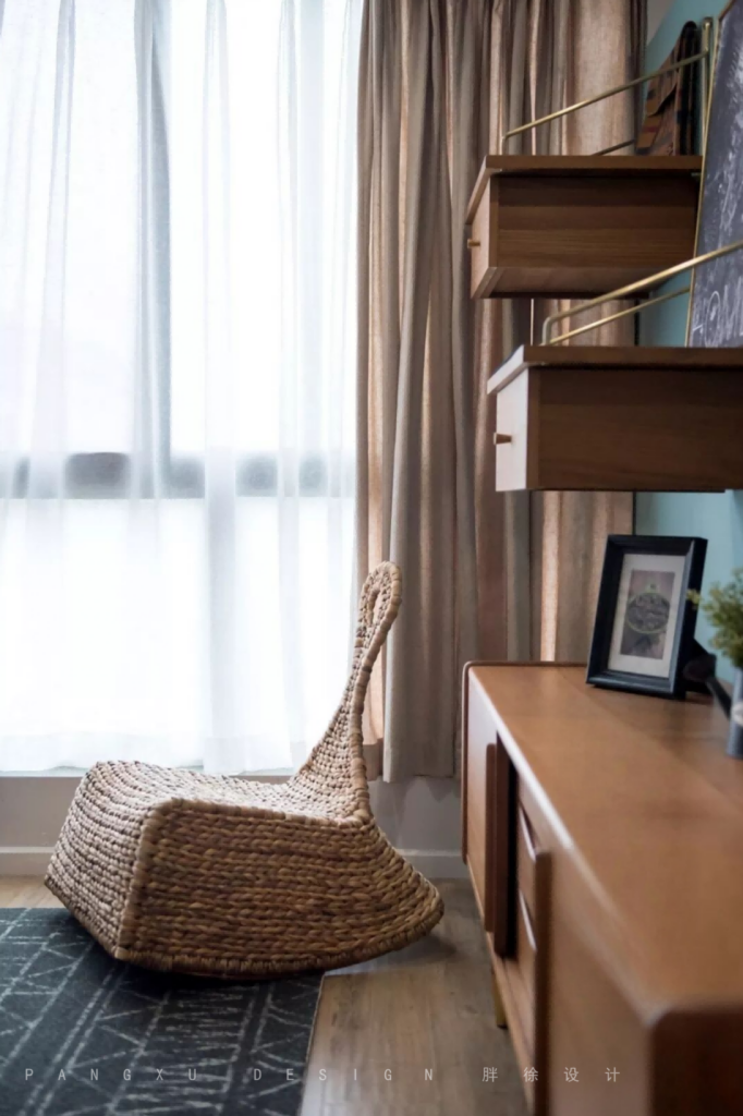 在二楼上面我们设计成了一个大套房的空间格局有书房、书房休憩阅读区域,有开放式的衣帽间、半独立的卧室睡眠,在设计的不断交流中,我们更加深刻的了解到他们的生活方式,或者说是生活态度。男主人是严谨的建筑师,女主人是恬静的小文青,这样的小两口,他们想要的更多的是属于他们两人的生活空间。所以,我们把二层做成一个大套房,他们的主卧、衣帽间和休闲区都集中在属于他们的私密空间,从而可以看出,属于他们这一类型生活态度的年轻人,所追求的生活的品质和习惯,透过设计都能感觉的到。