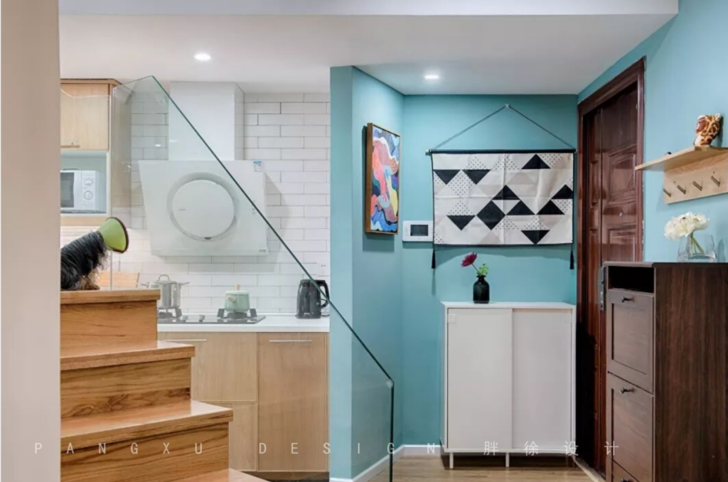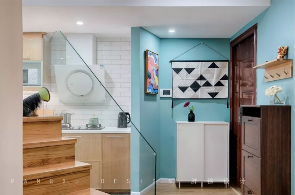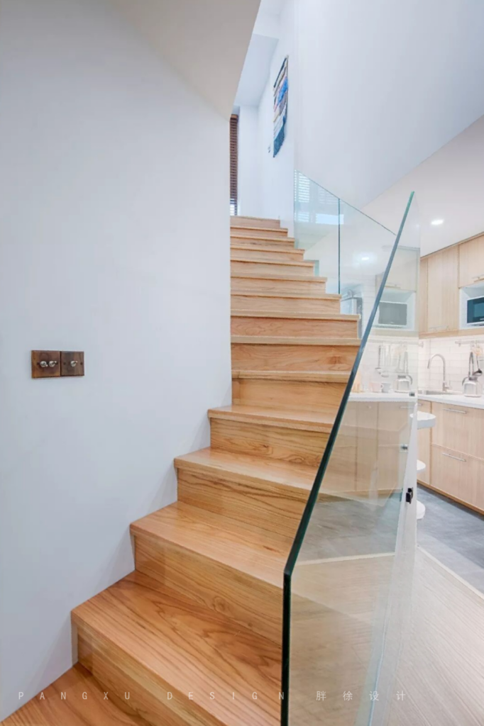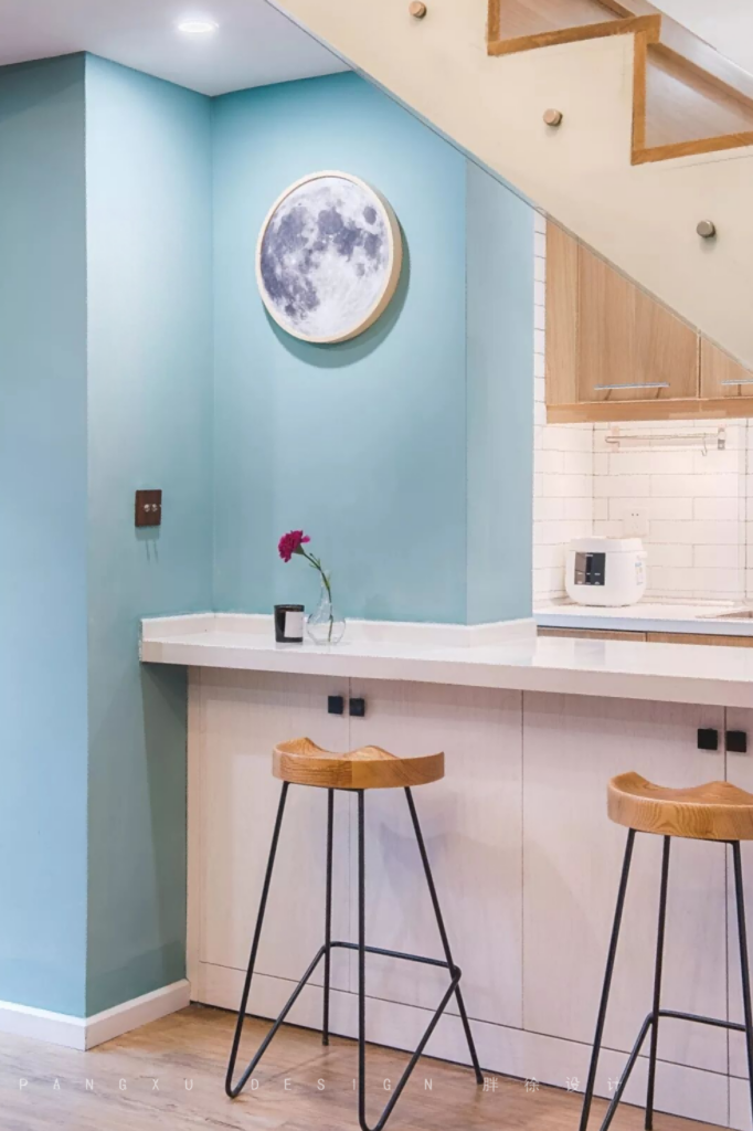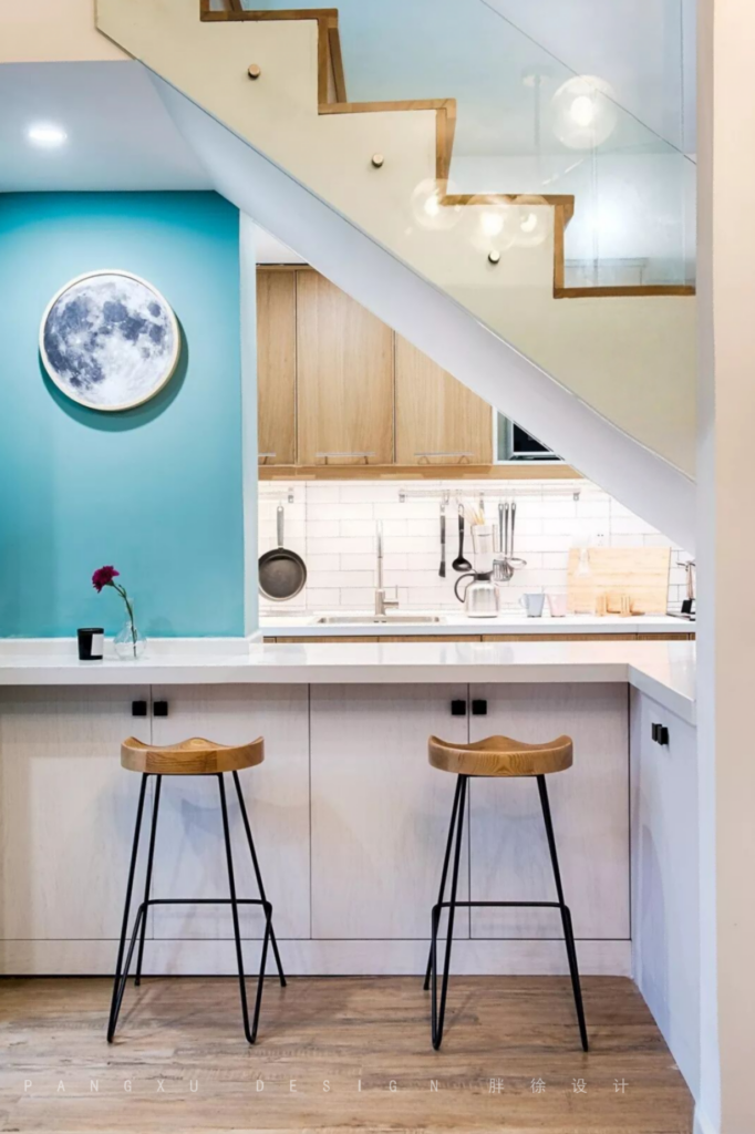 总共93.8㎡层不足50㎡的空间,在尊重和在了解业主生活方式后,我们把楼梯同厨房吧台以及电视墙储藏空间做了有机的融合。原始的厨房空间很小,而且只能进行单面操作,经过我们的重新空间规划把厨房空间打开,做出了开放式的厨房格局,对面做上了符合业主操作习惯高度的吧台,靠厨房的这面操作,靠客厅的这面做成吧台和简餐台使用,楼梯下部的空间利用起来储物。客厅的家具布置形态在保留基本的视听、会客功能基础上同时保留了女主人的手工爱好及制作区域。