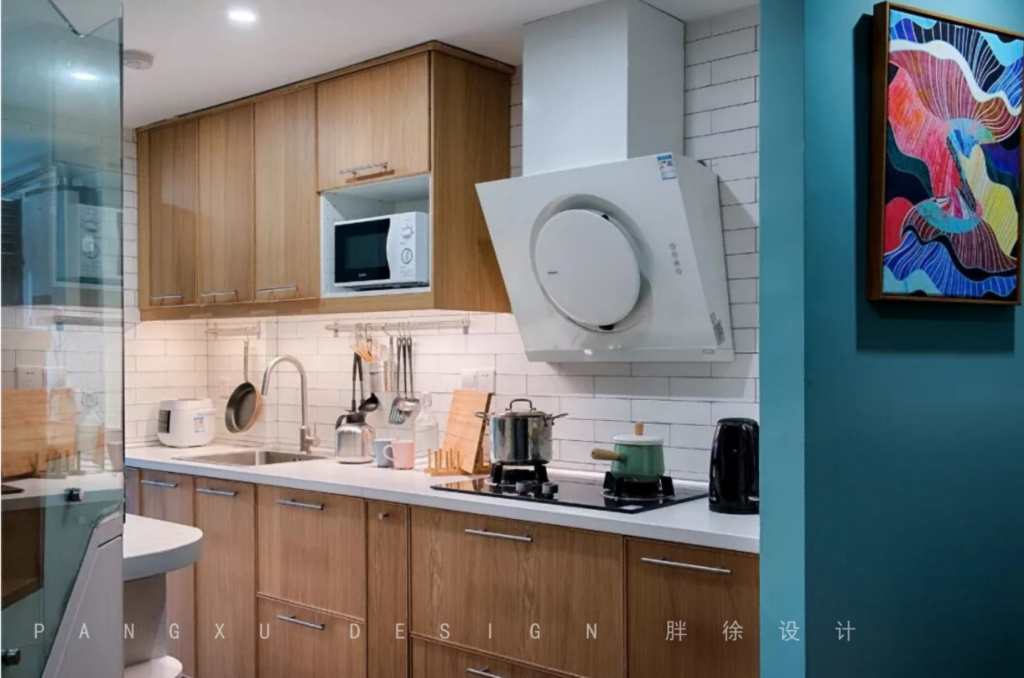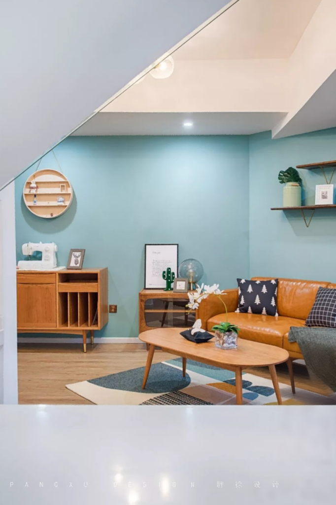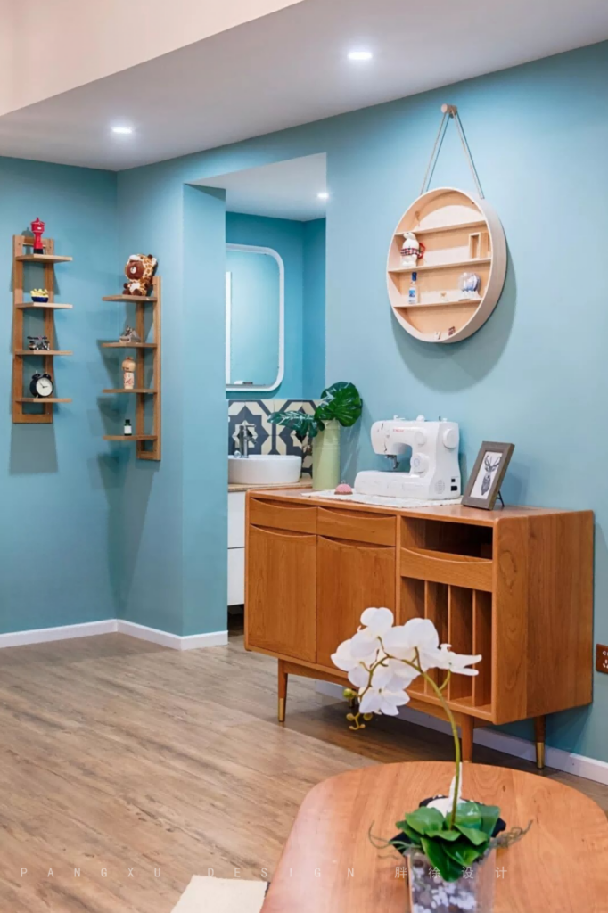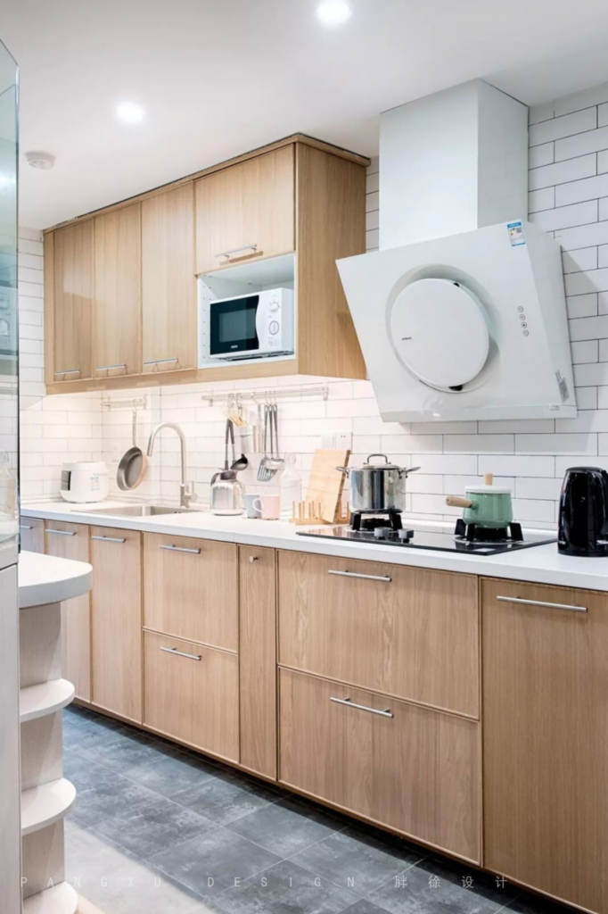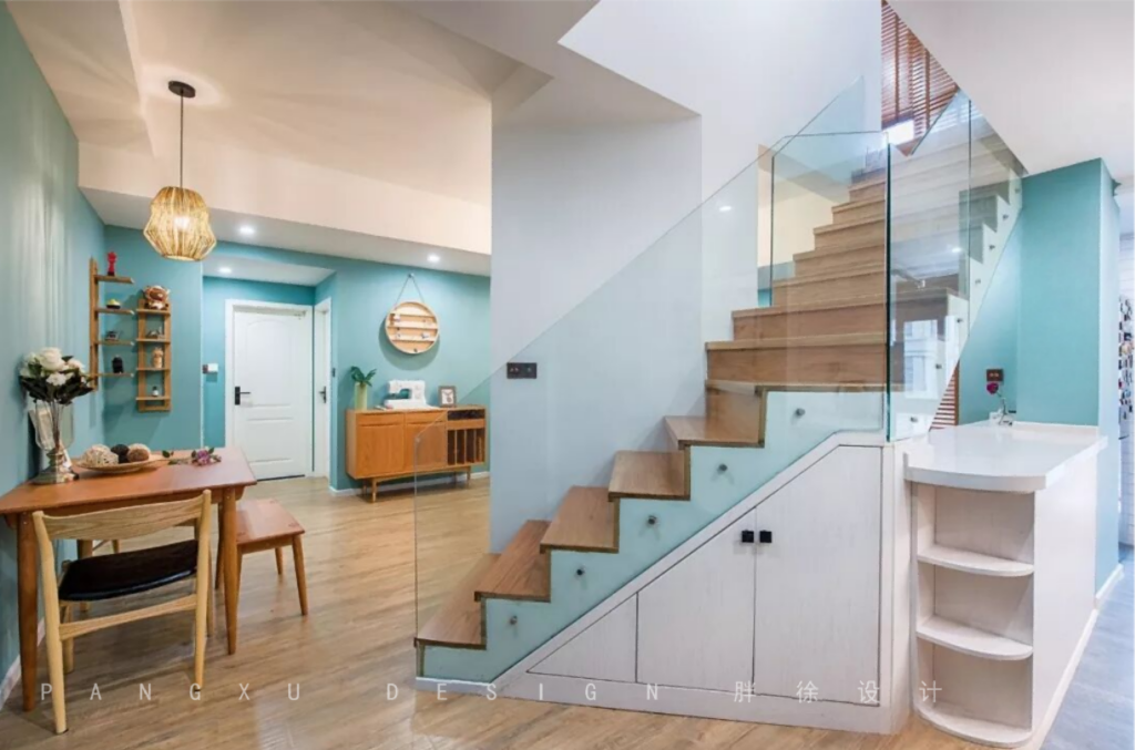 总共93.8㎡层不足50㎡的空间,在尊重和在了解业主生活方式后,我们把楼梯同厨房吧台以及电视墙储藏空间做了有机的融合。原始的厨房空间很小,而且只能进行单面操作,经过我们的重新空间规划把厨房空间打开,做出了开放式的厨房格局,对面做上了符合业主操作习惯高度的吧台,靠厨房的这面操作,靠客厅的这面做成吧台和简餐台使用,楼梯下部的空间利用起来储物。客厅的家具布置形态在保留基本的视听、会客功能基础上同时保留了女主人的手工爱好及制作区域。